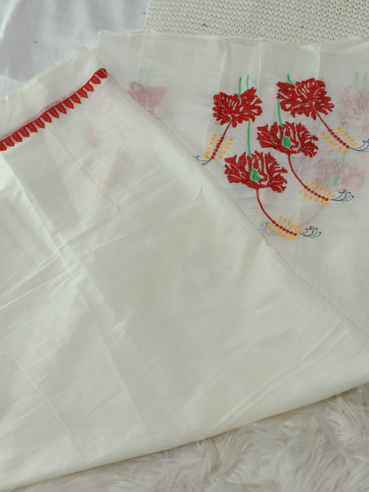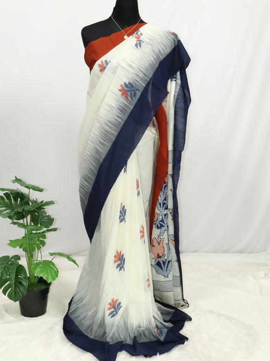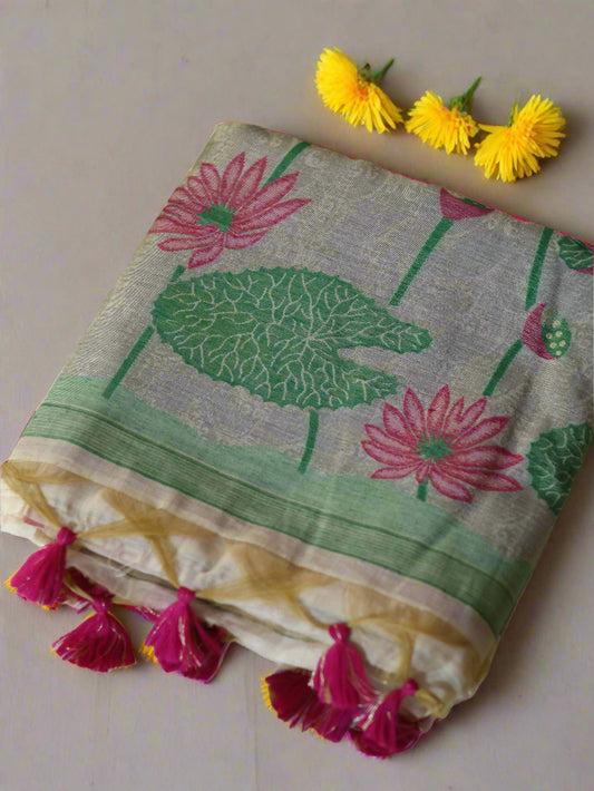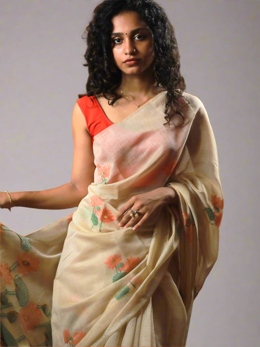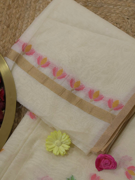 Explore our stunning off white sarees in different fabric types and style perfect for traditional functions and temple visits.