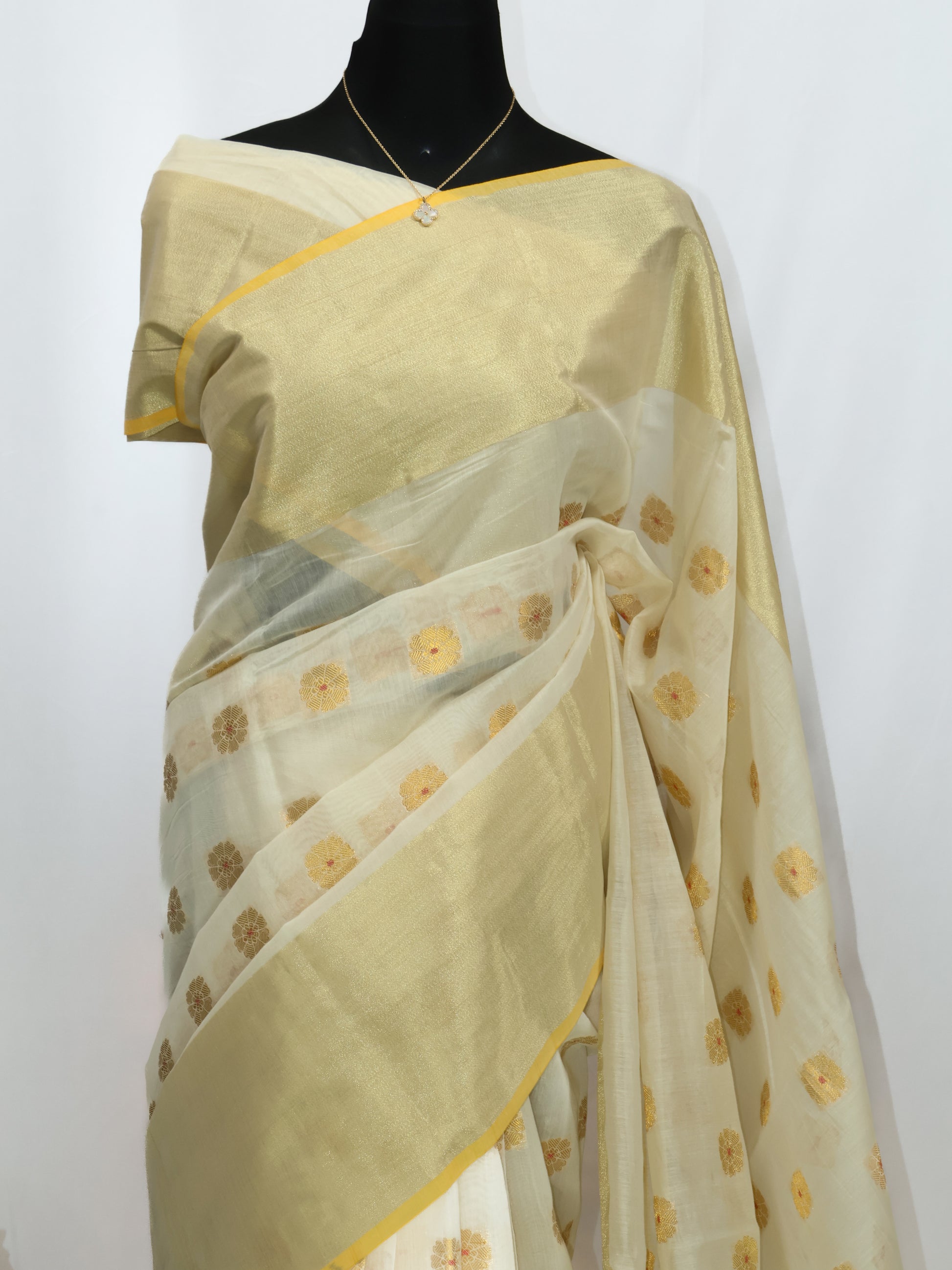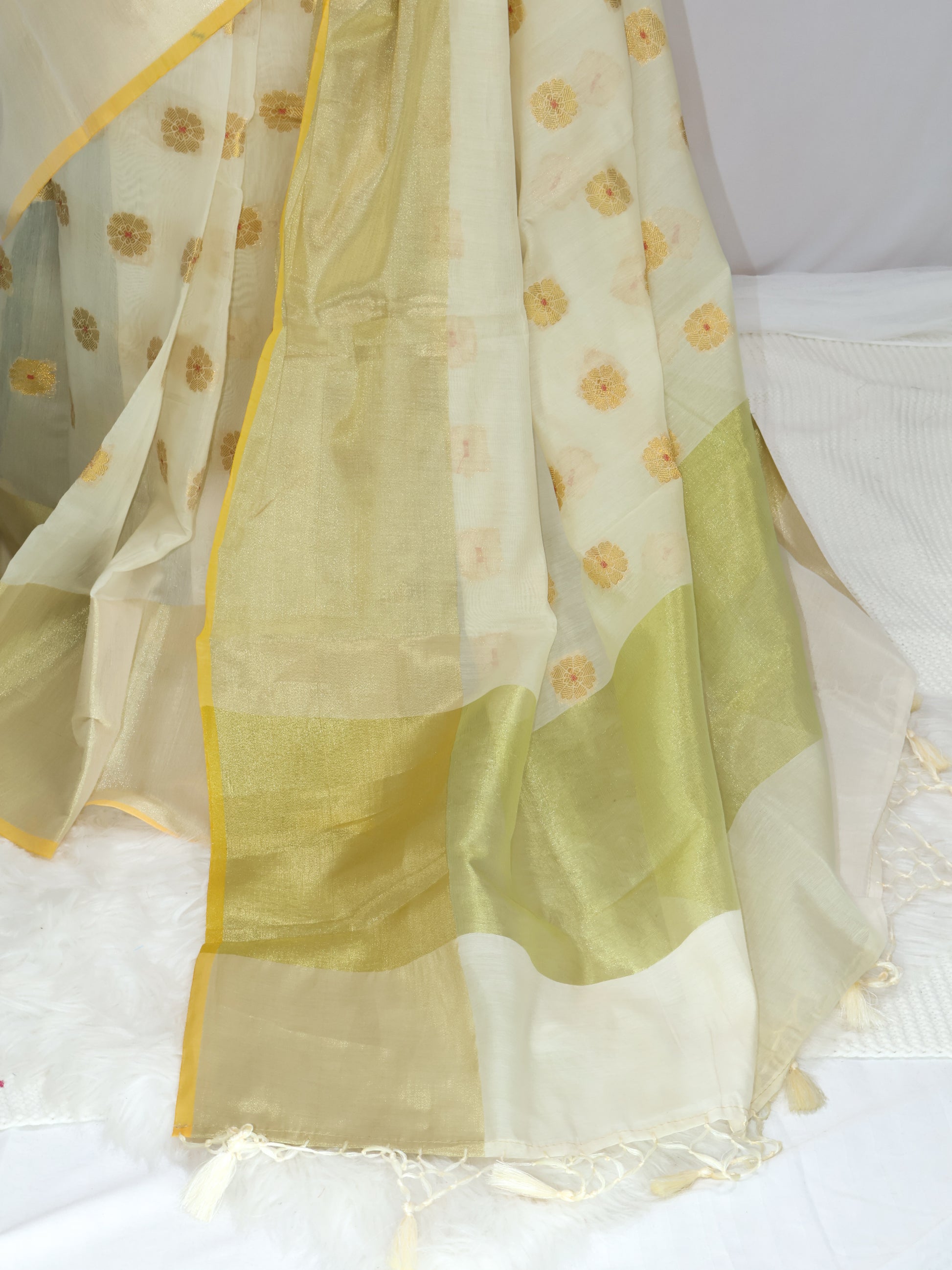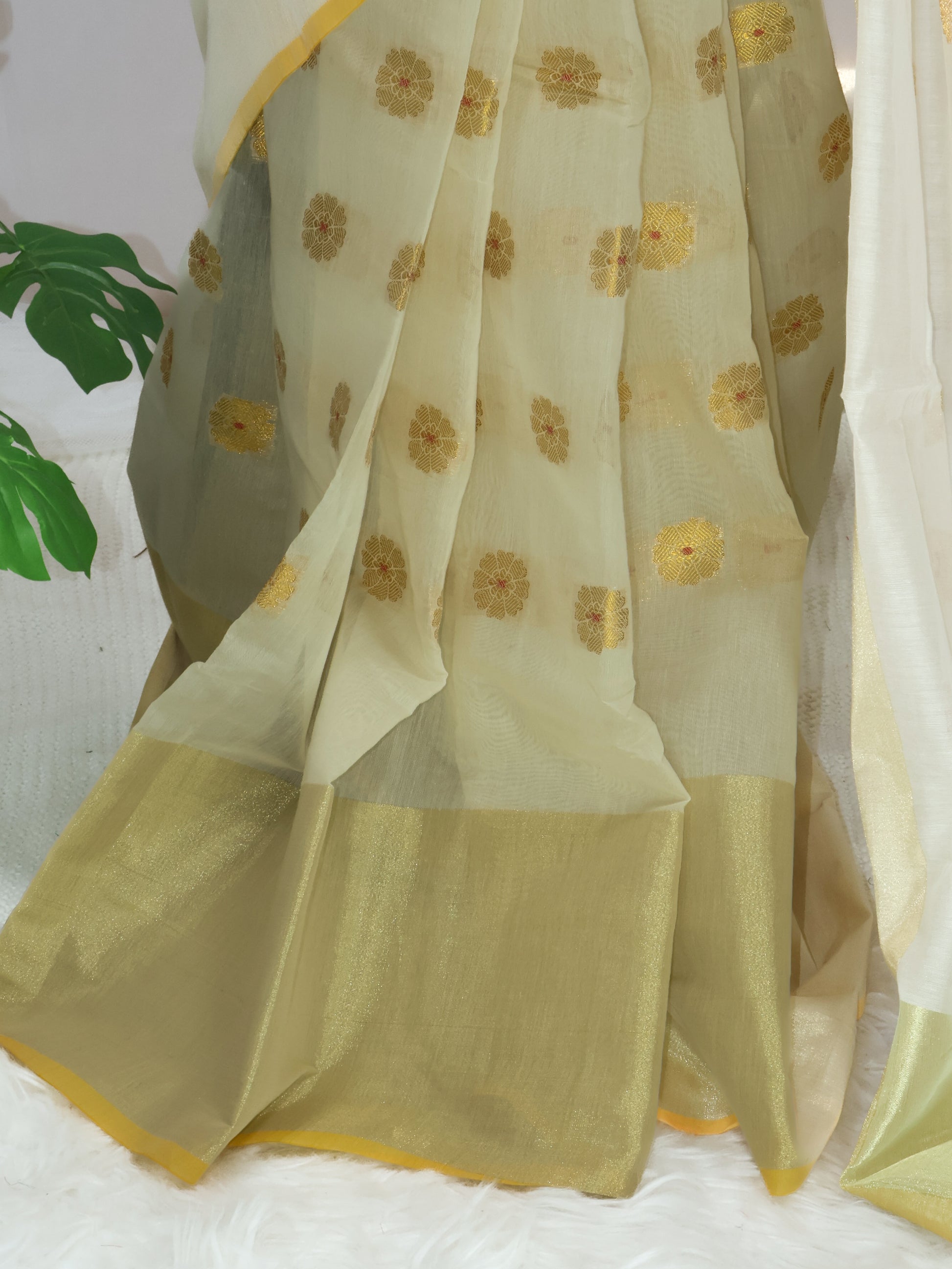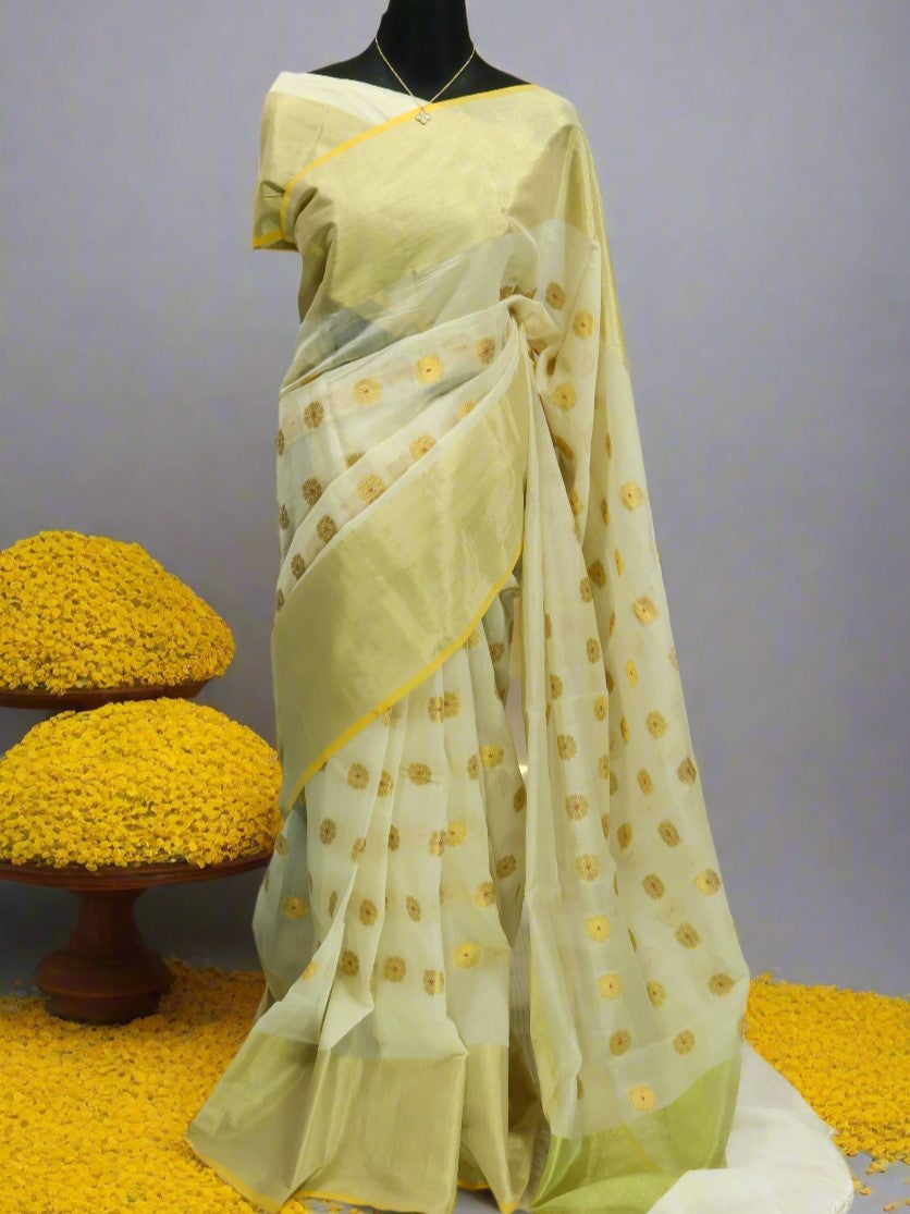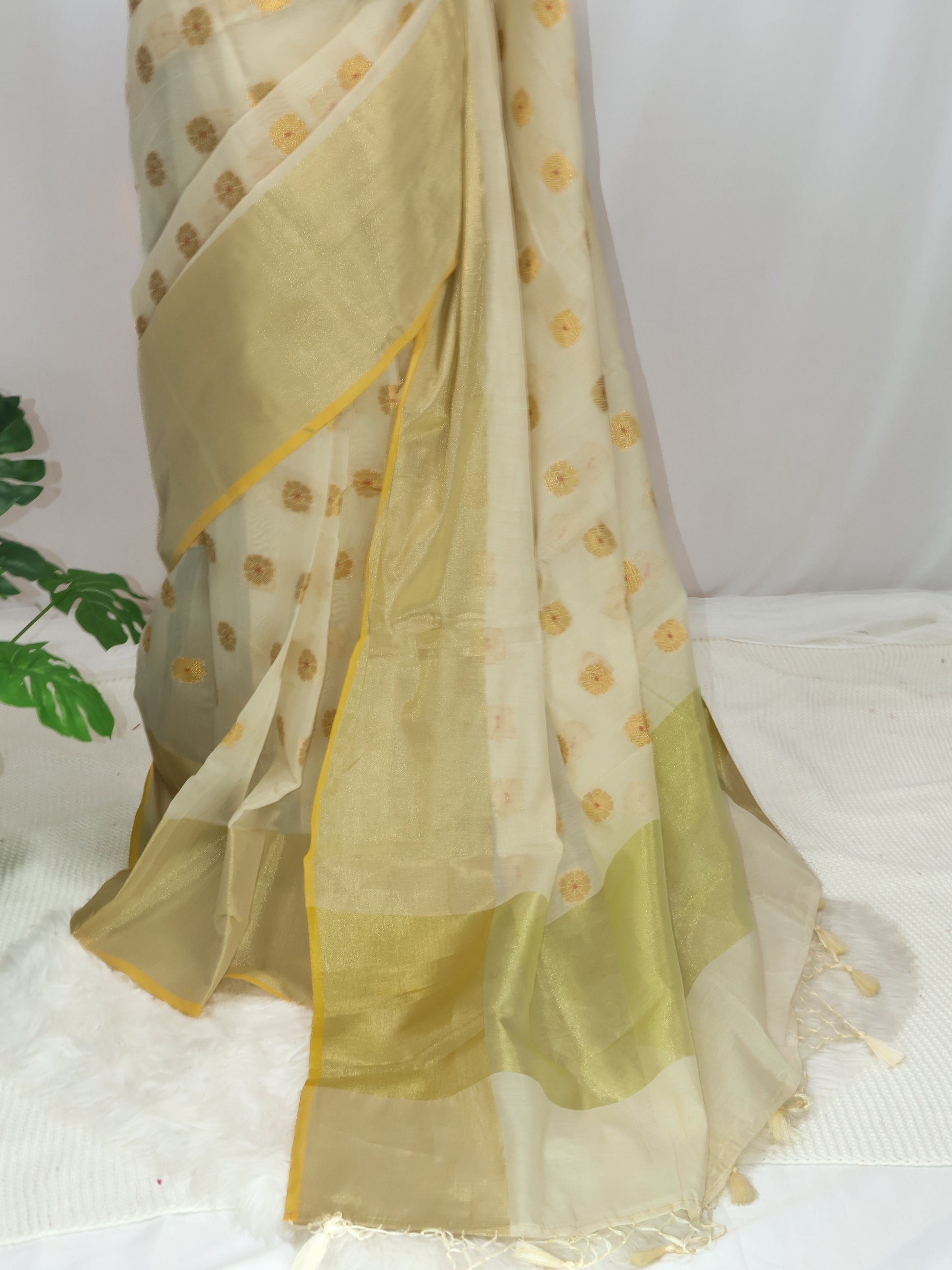 Saree work: Banarasi cotton soft silk with golden tissue zari and woven butas