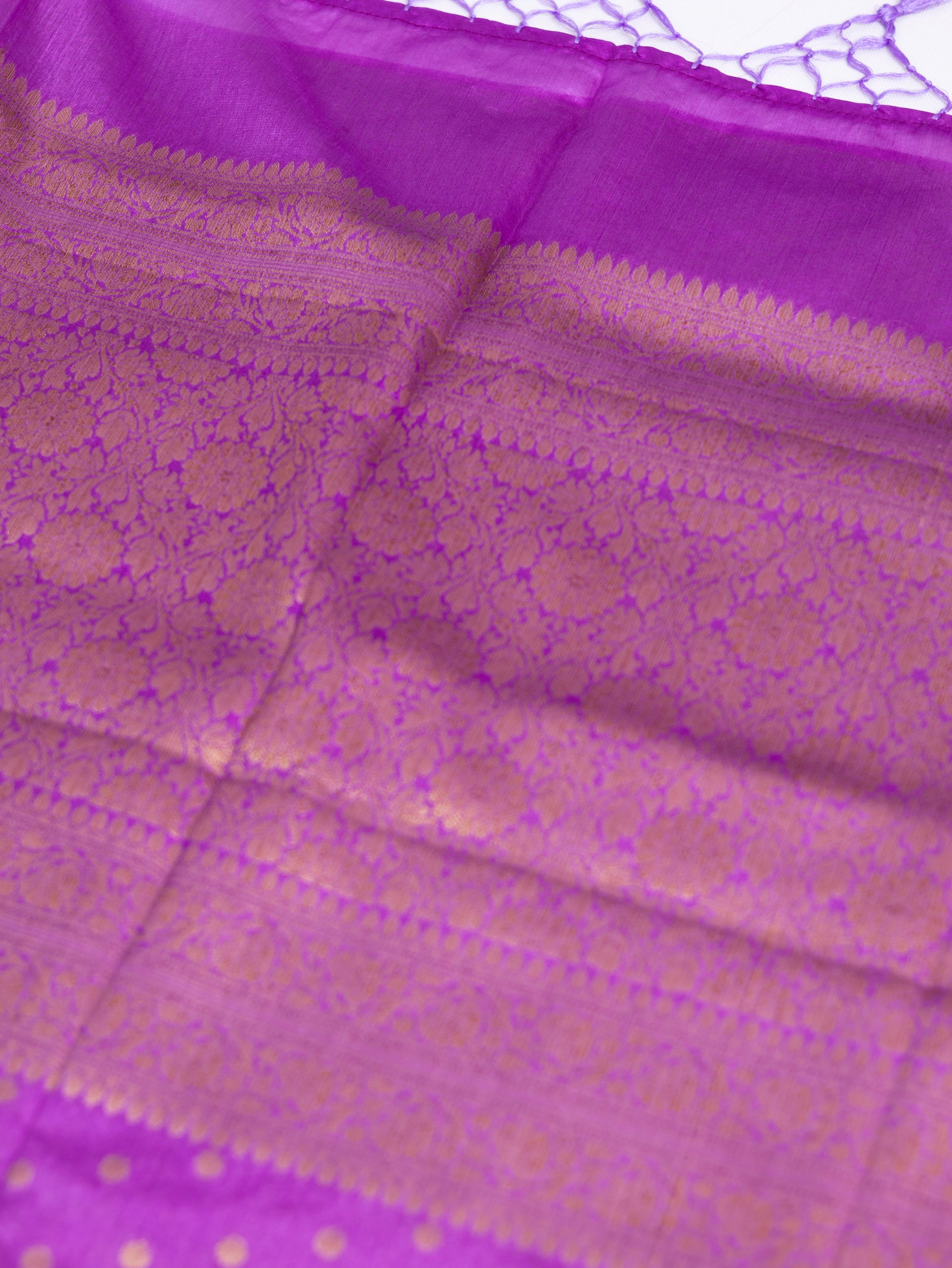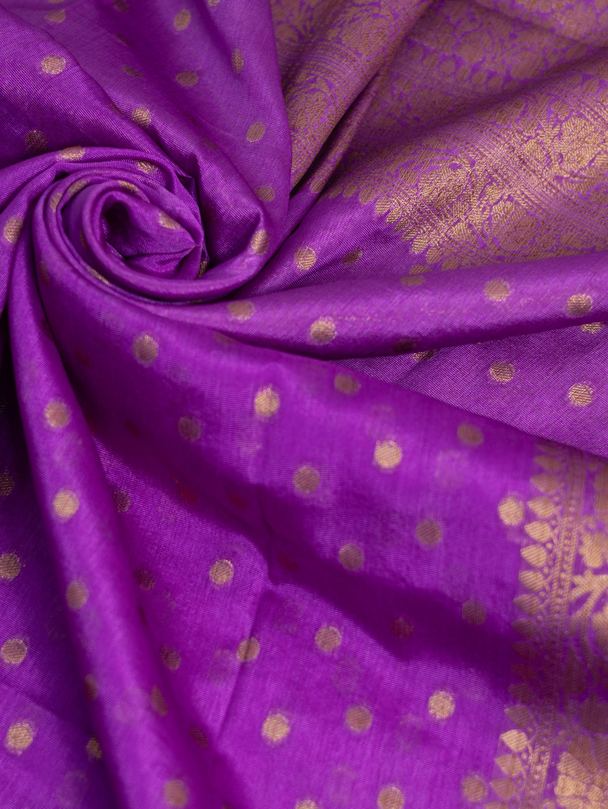 Woven in soft semi silk, the saree features classic Banarasi-inspired golden zari motifs that add depth and richness without overpowering the elegance of the colour. The rare orchid shade lends a contemporary charm while retaining a deeply traditional essence, making it a standout choice for refined festive dressing.