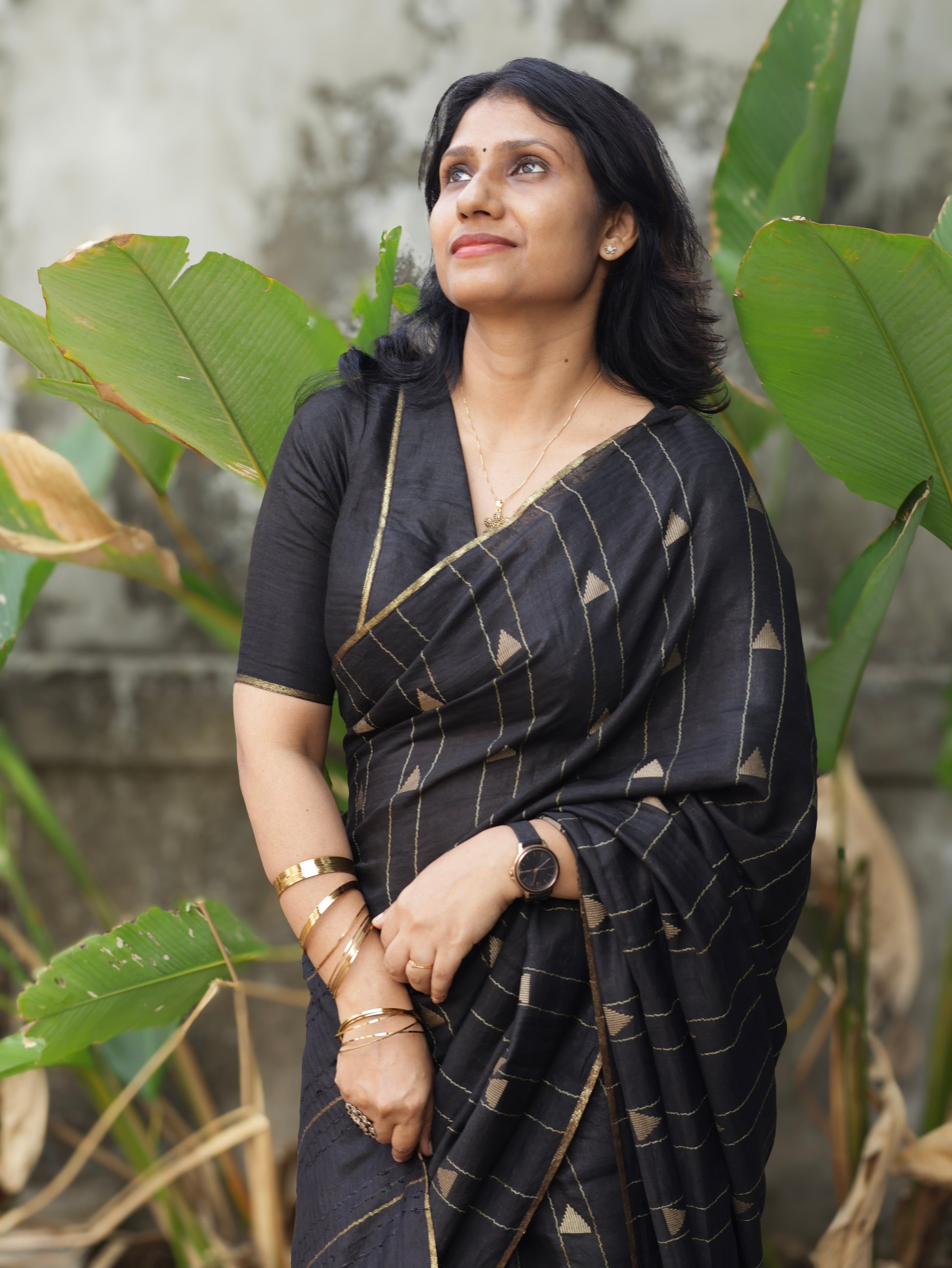 The Noir Rekha Bhagalpuri Silk Saree is a refined expression of understated luxury, crafted for women who appreciate classic elegance with a modern sensibility. Woven in soft Bhagalpuri silk, this saree features a rich black base highlighted with delicate gold woven patterns and fine linear accents that lend depth and quiet sophistication.