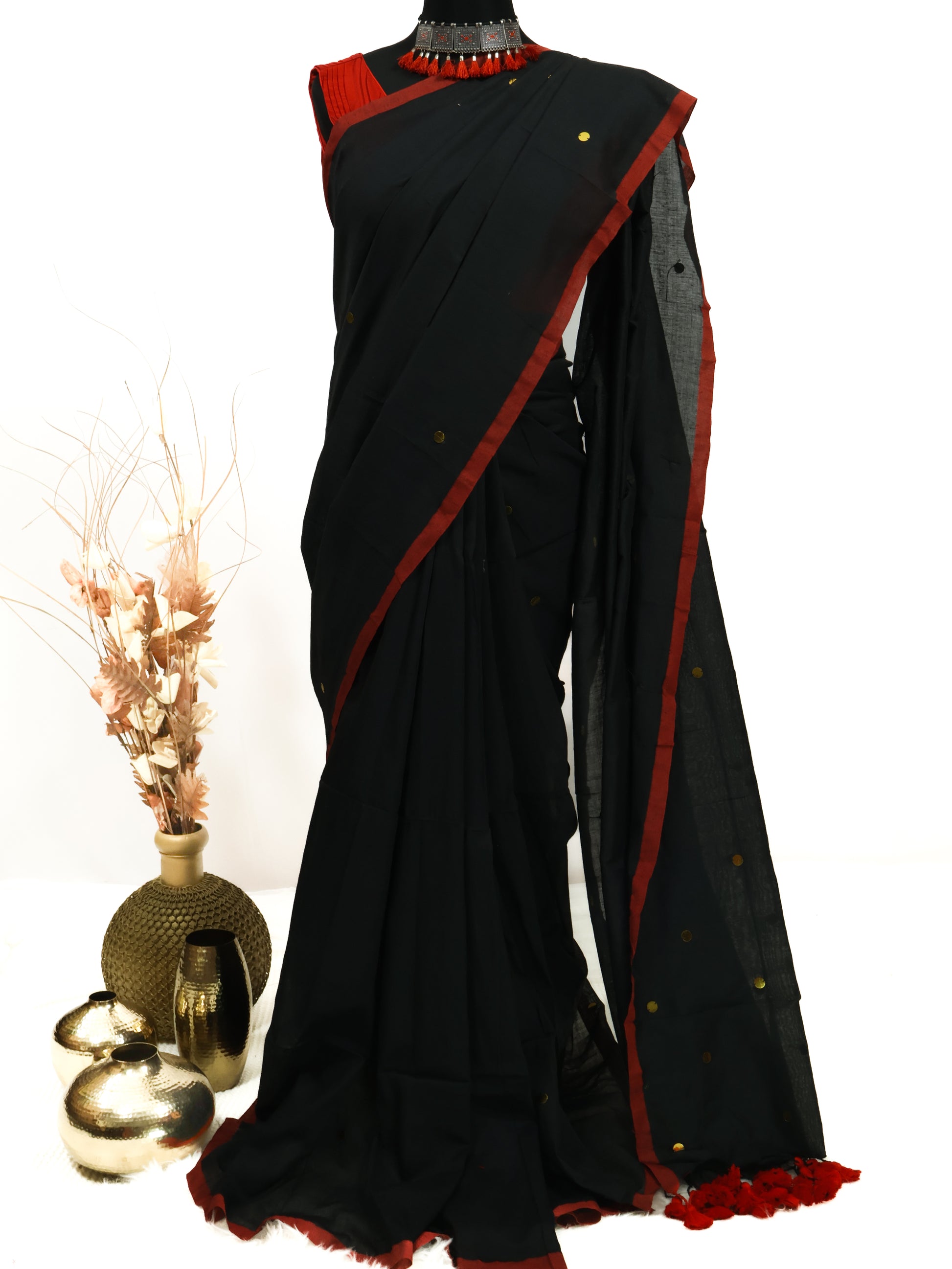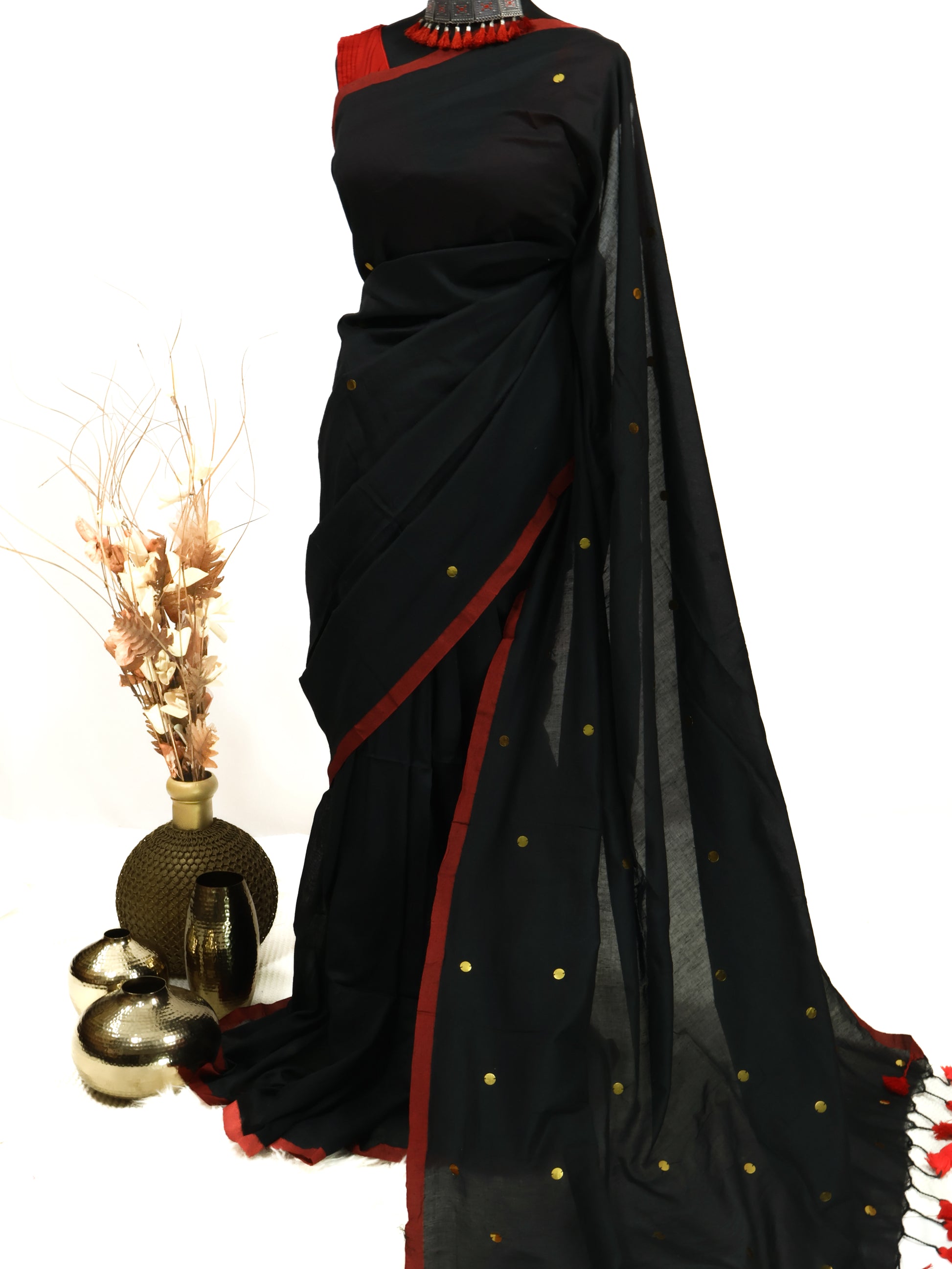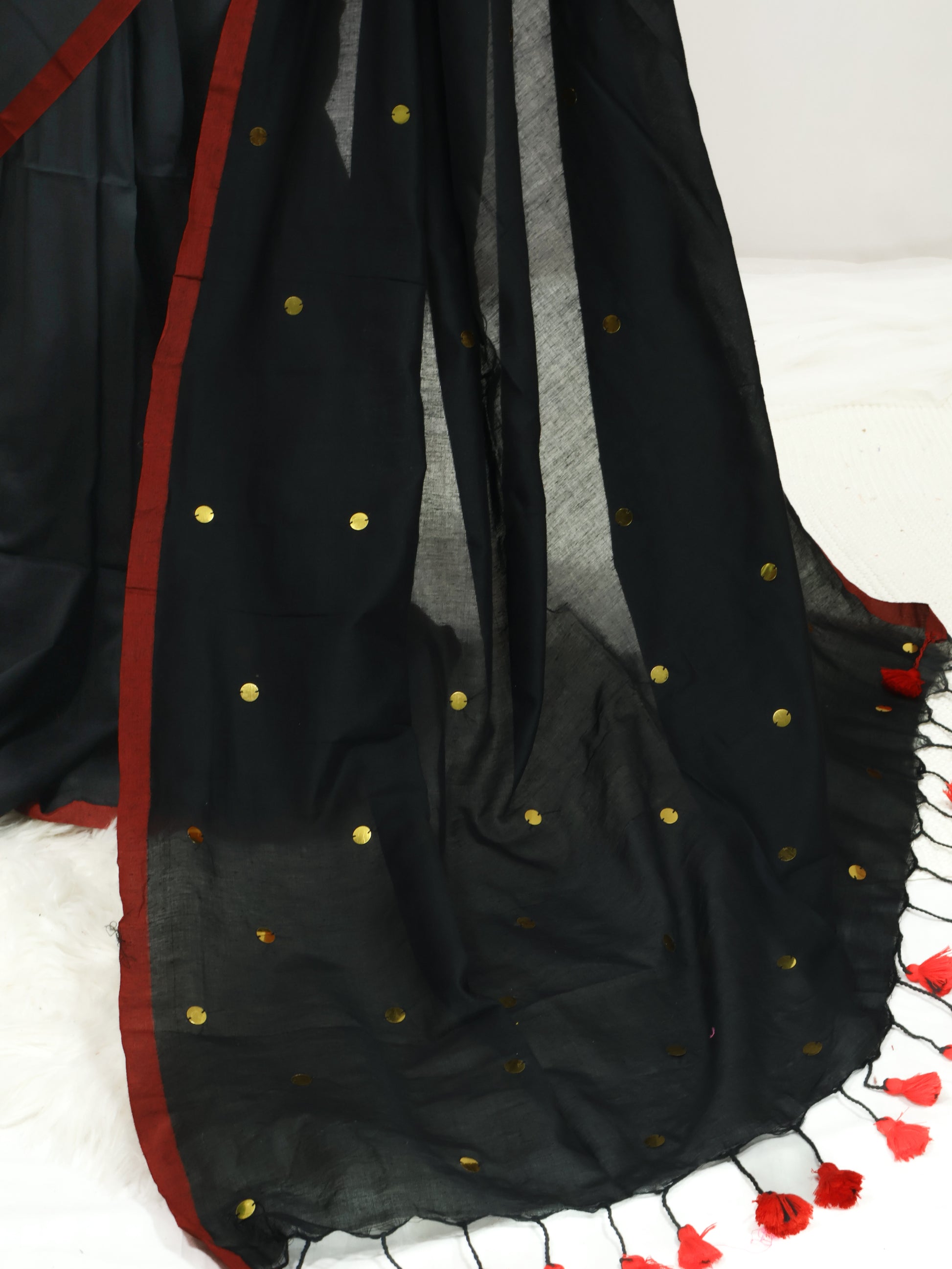Black Khadi gini cotton saree with golden sequence and tassels.
