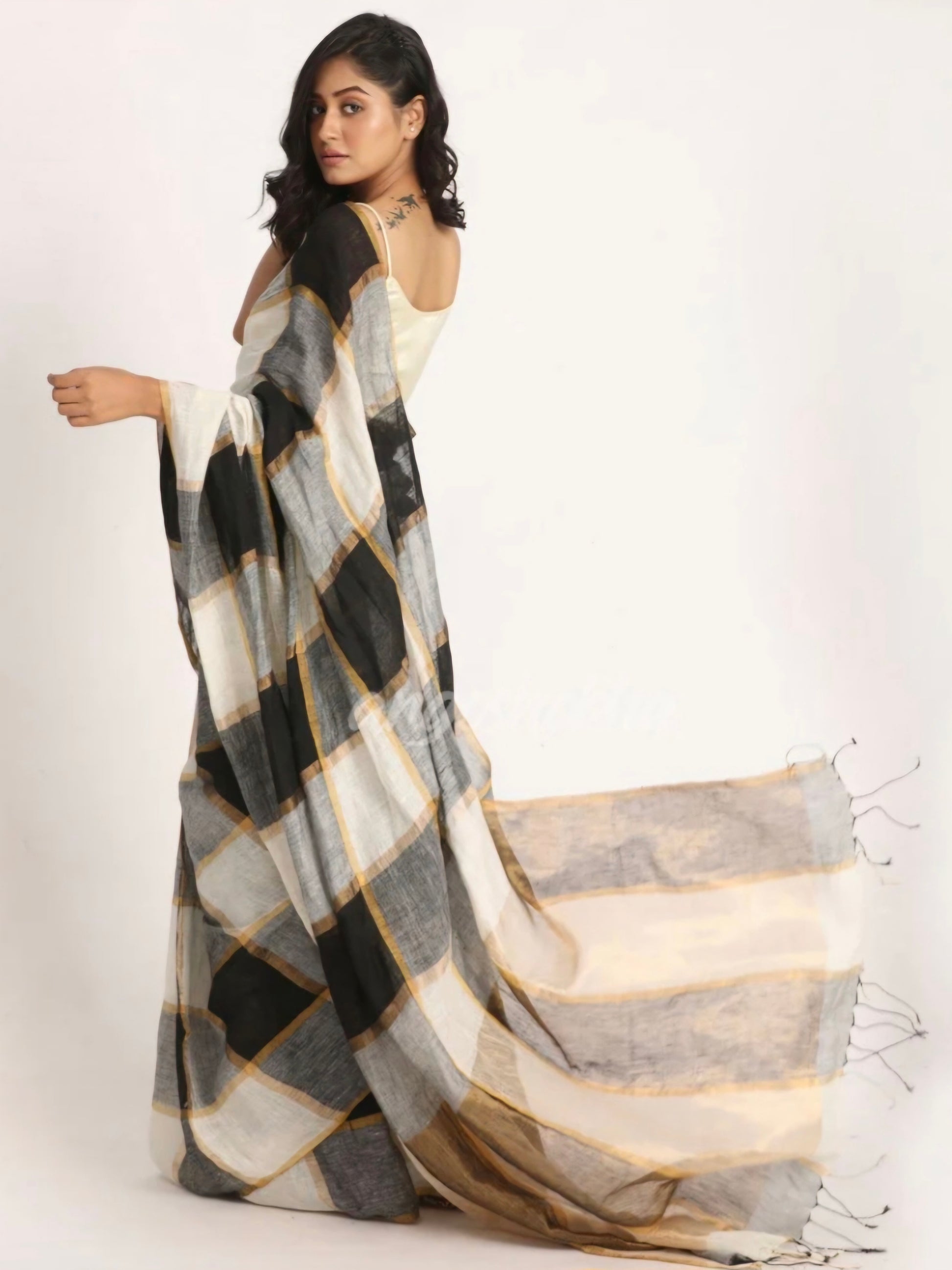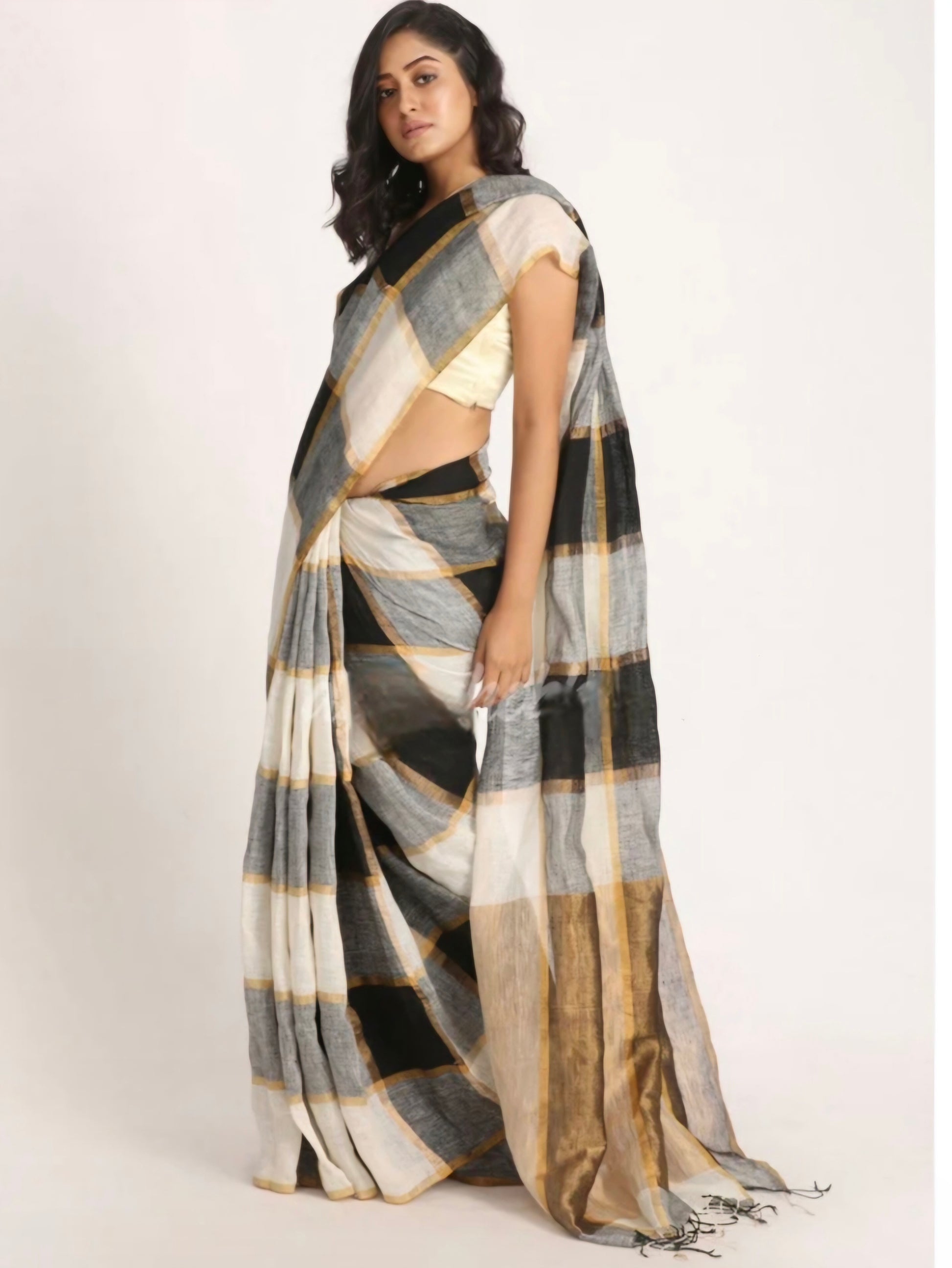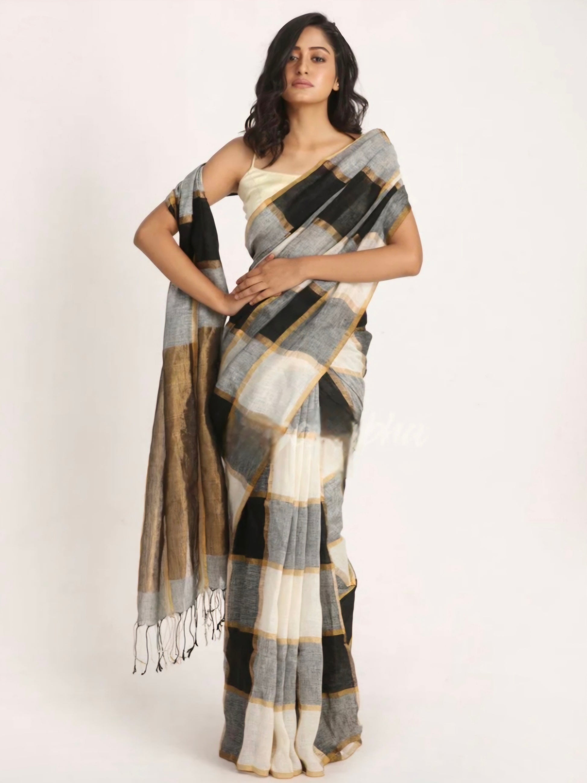 Black ,white and golden pure linen handwoven box saree