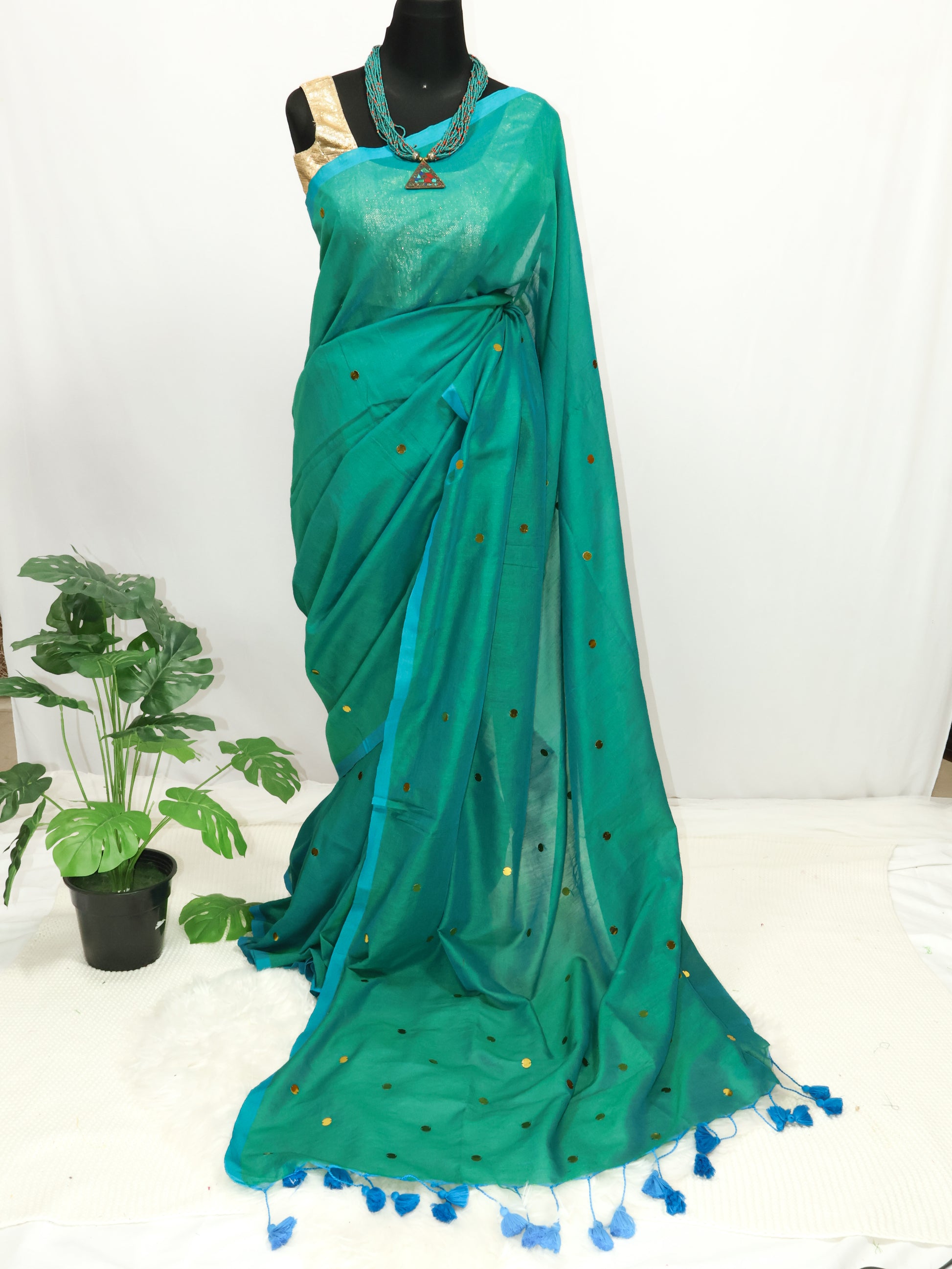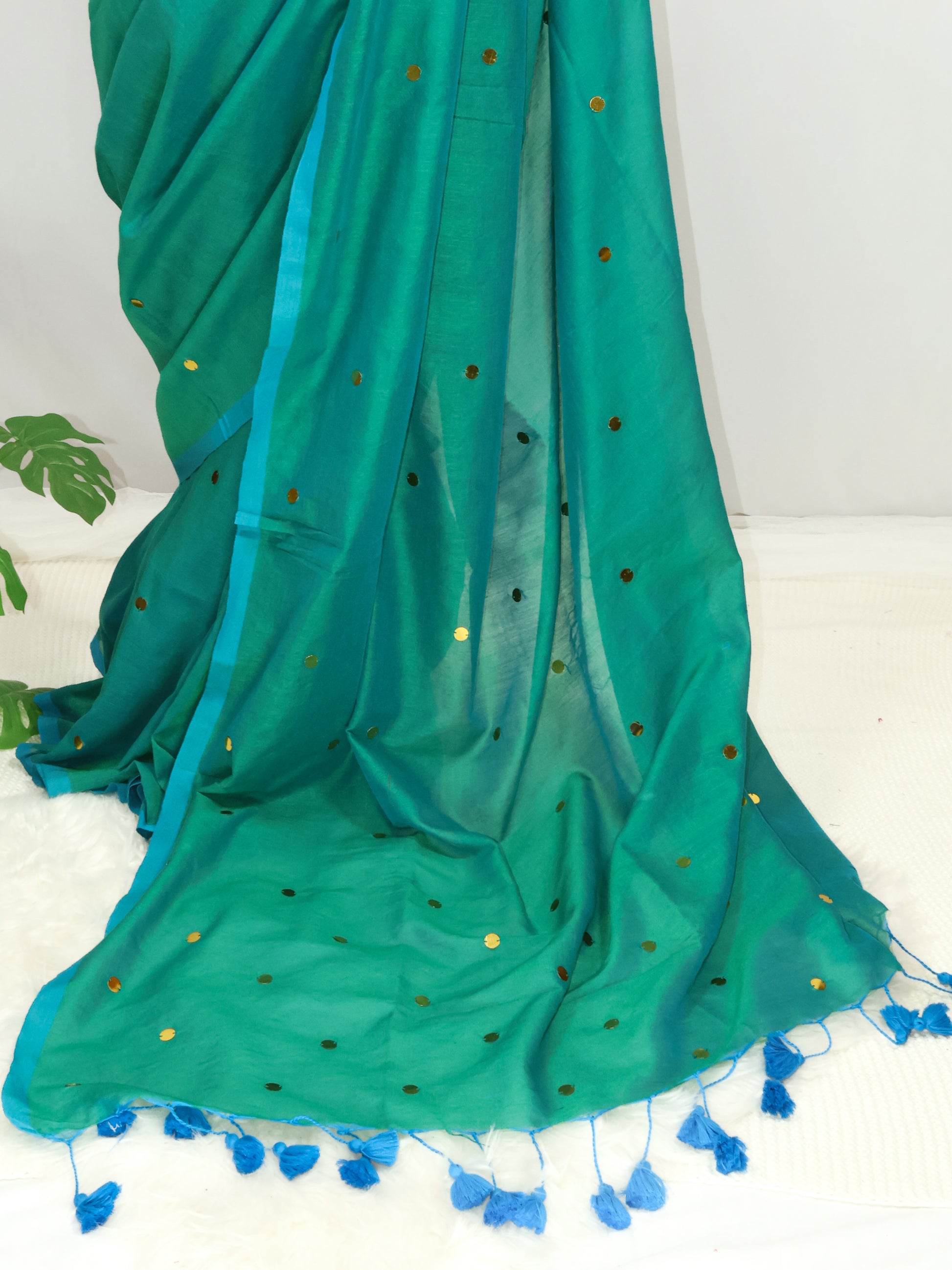 Blue-Green gini cotton saree with golden sequence and tassels.