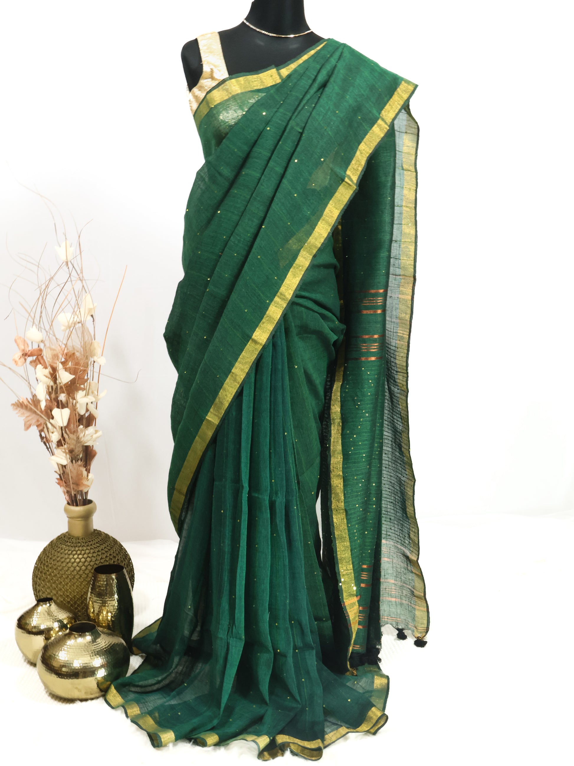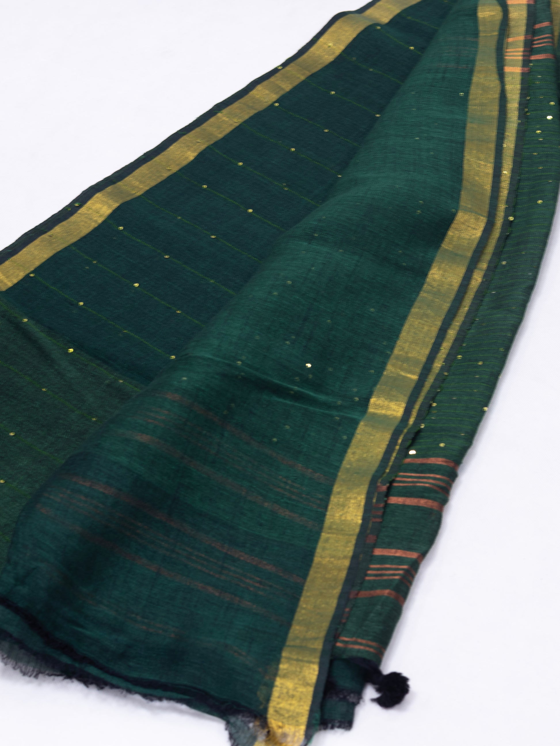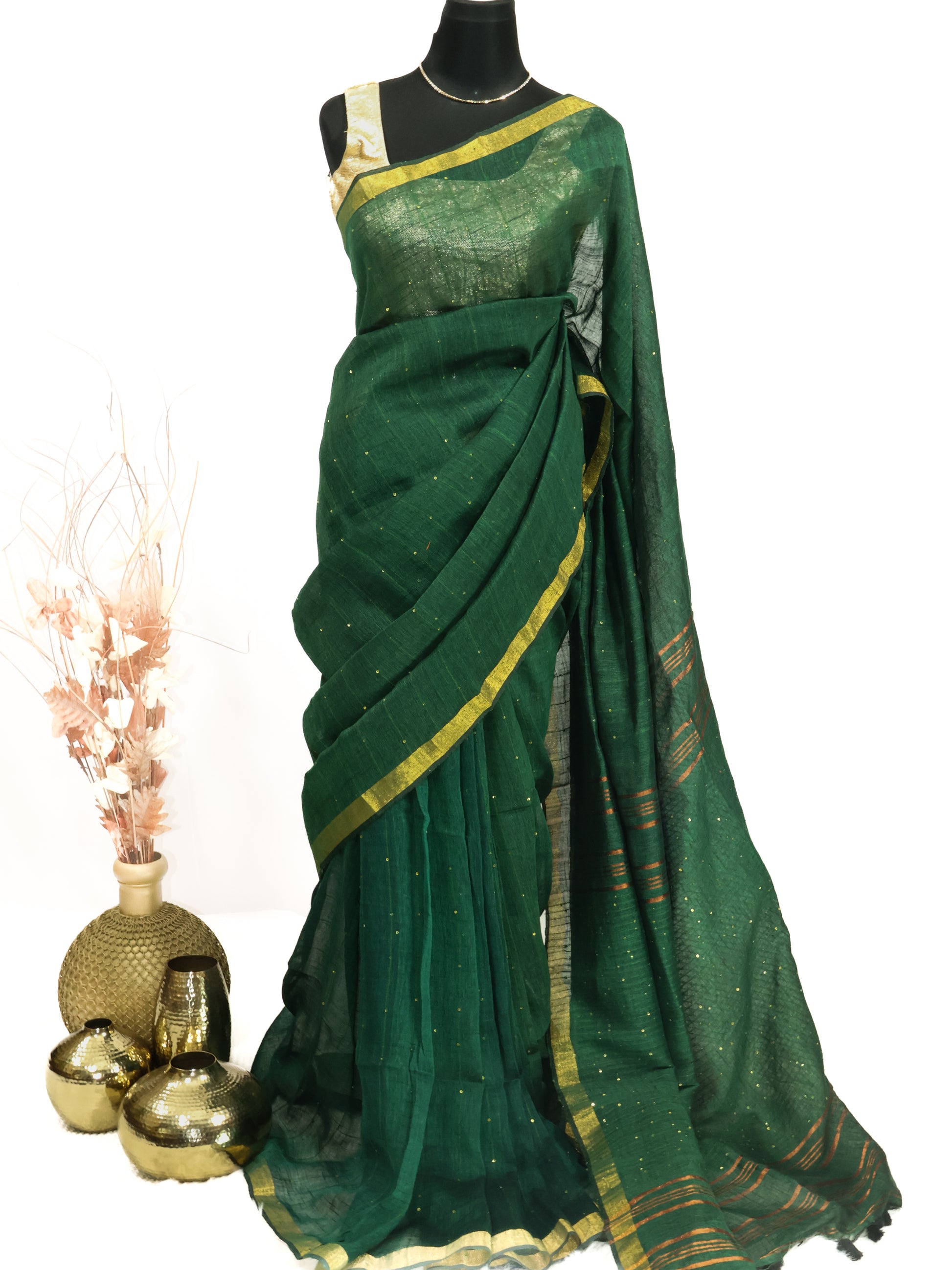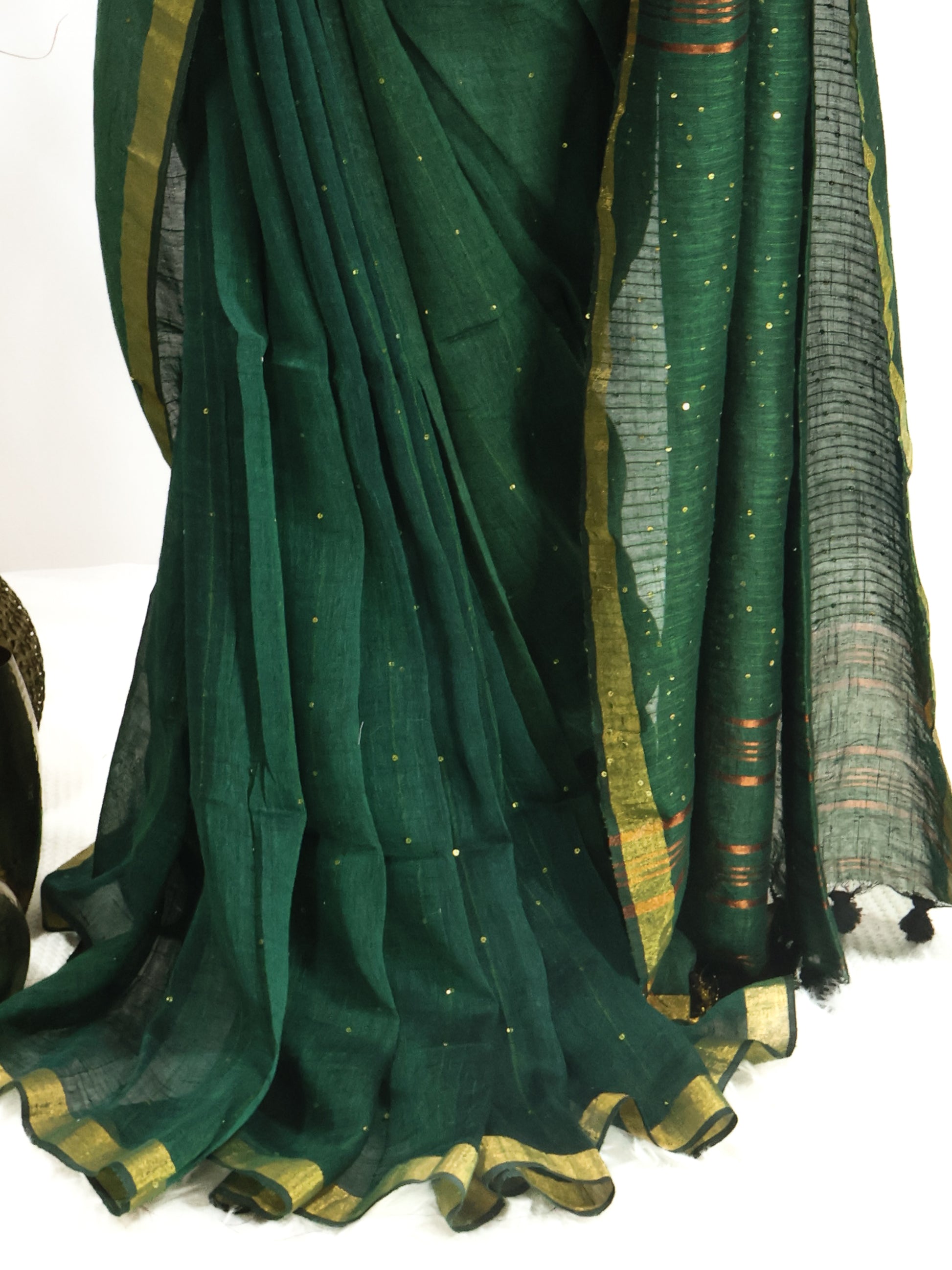 Bottle green sequence pure linen saree with golden zari border and tassels