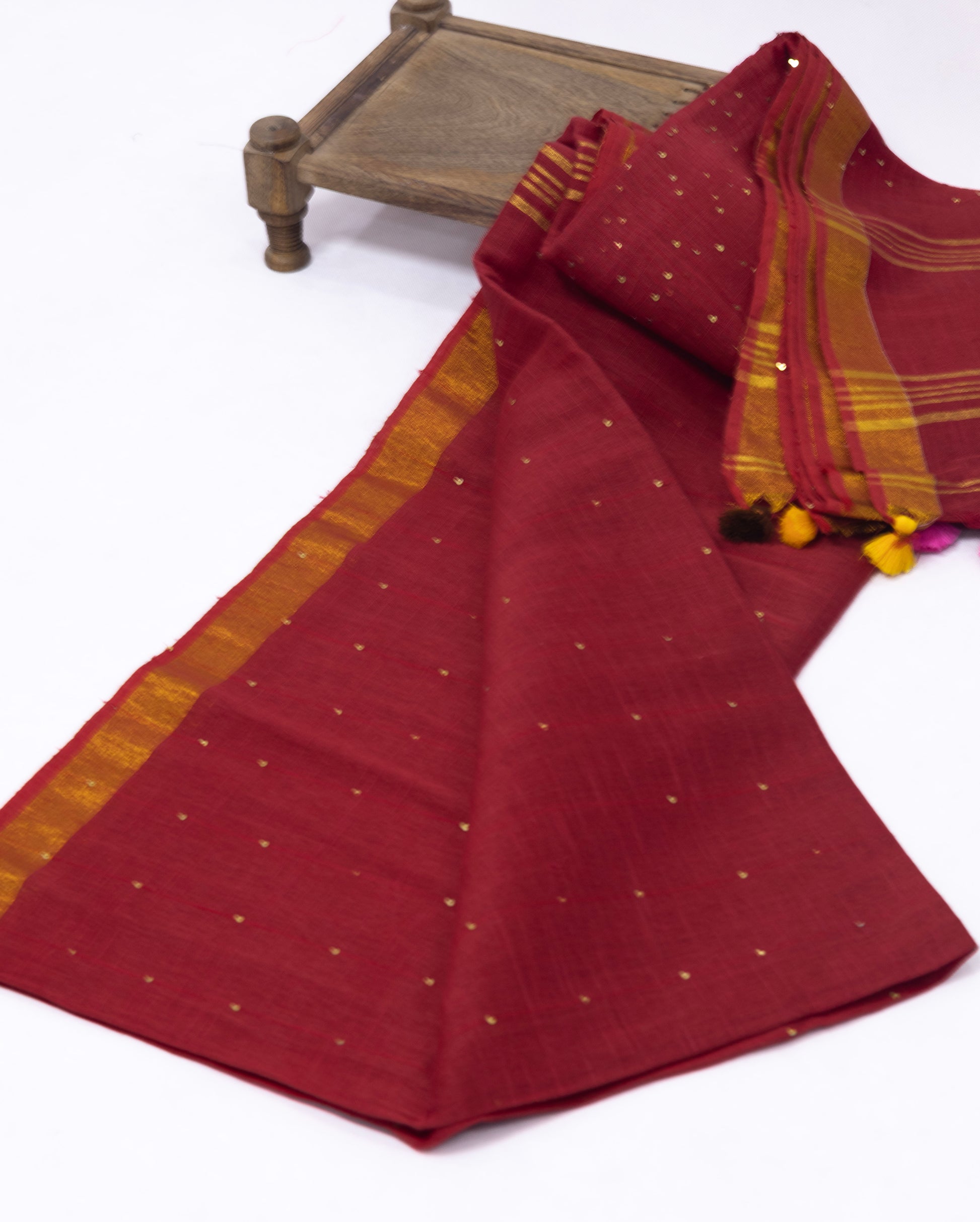 Chilli red sequence pure linen saree with golden zari border and tassels