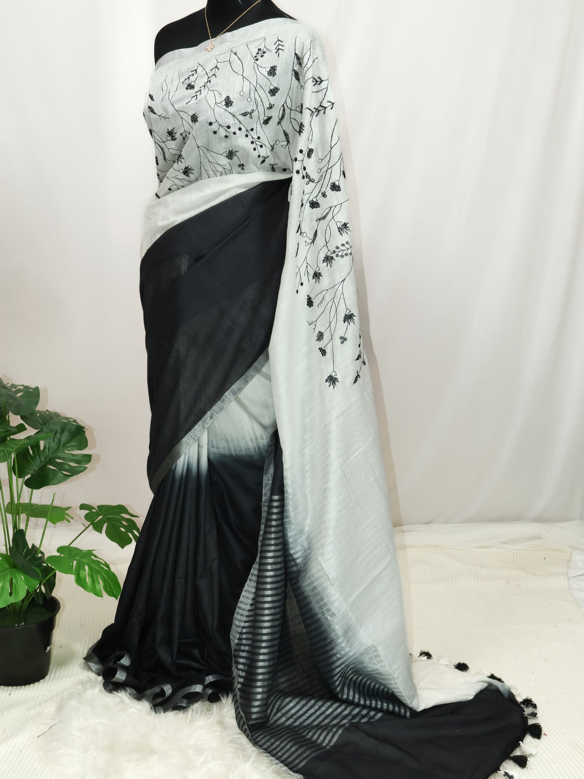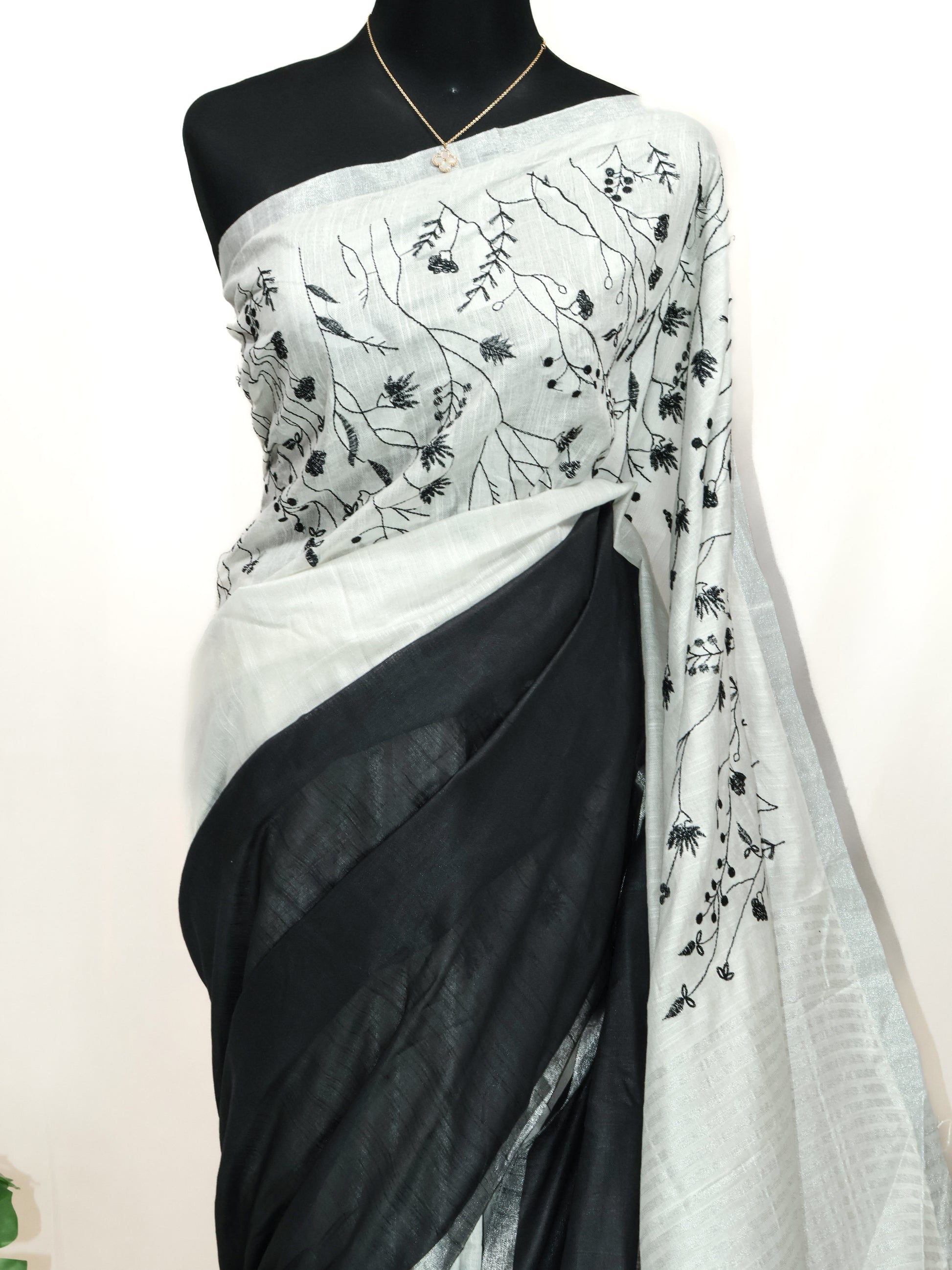 Saree work: Woven with one cotton & one linen thread embroidered saree