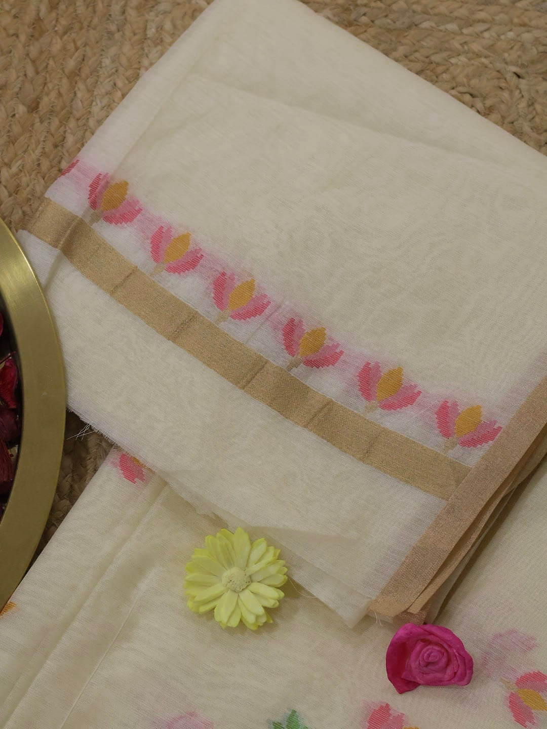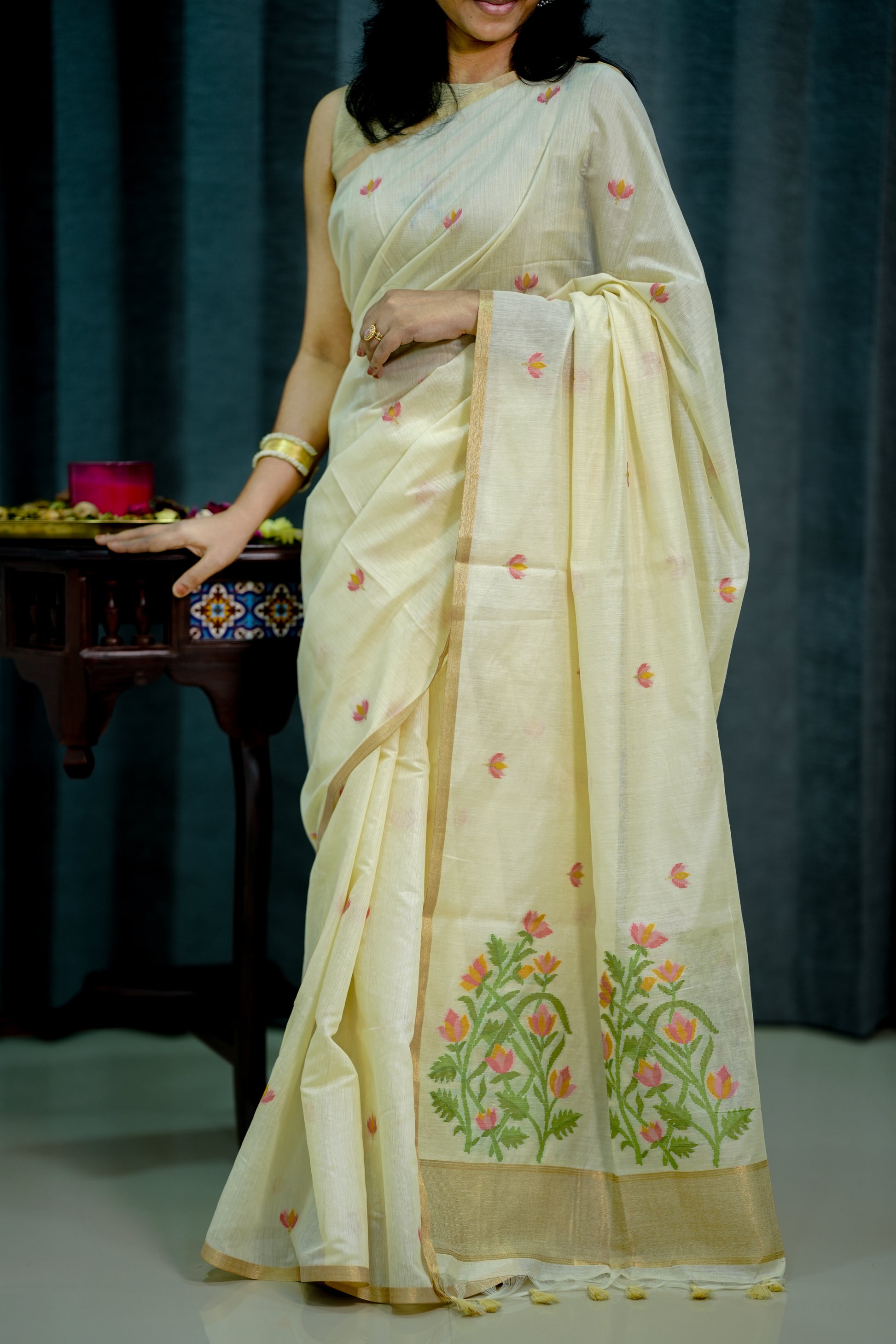 Cotton silk saree with woven lotus flowers and thin golden zari