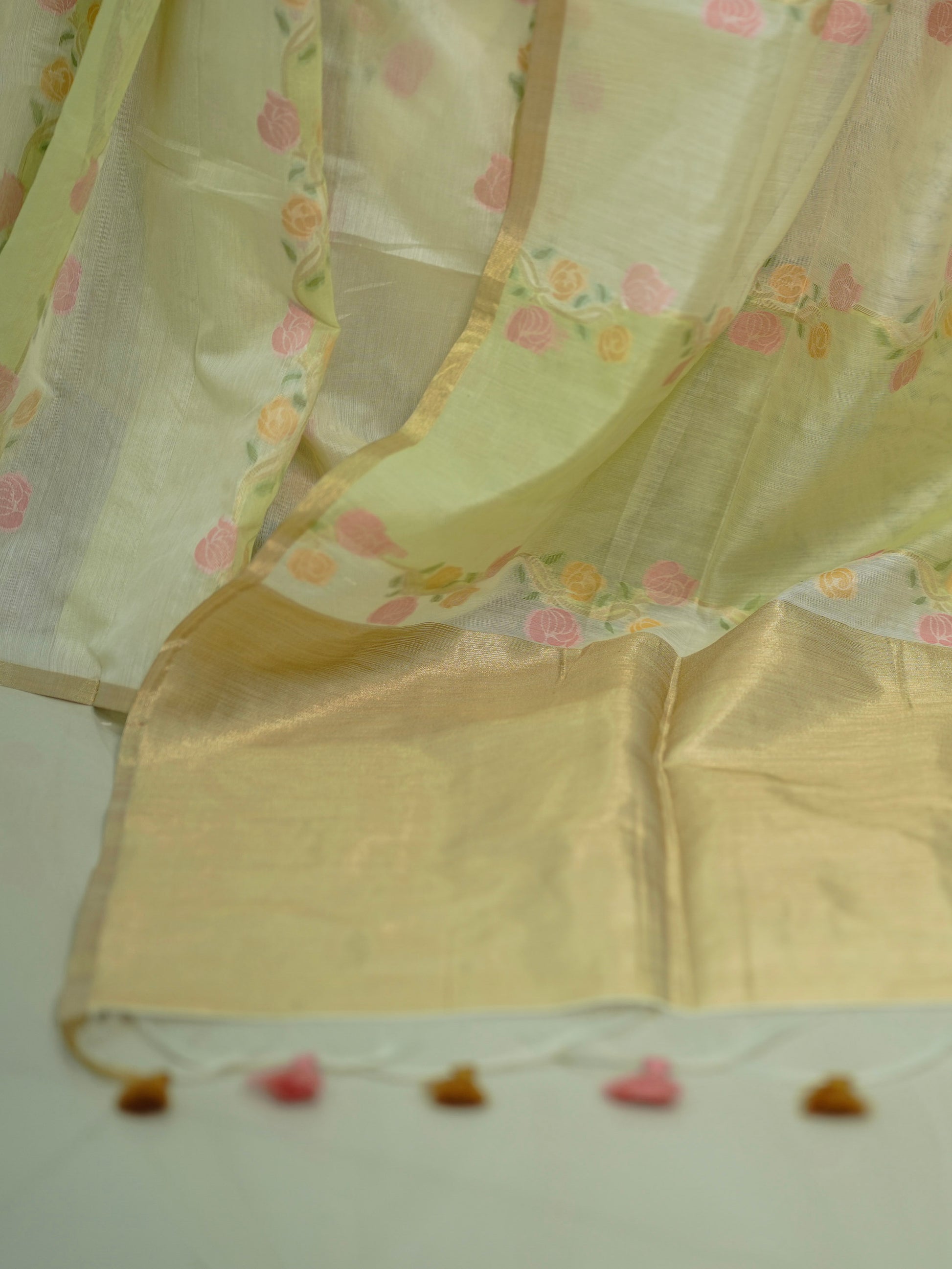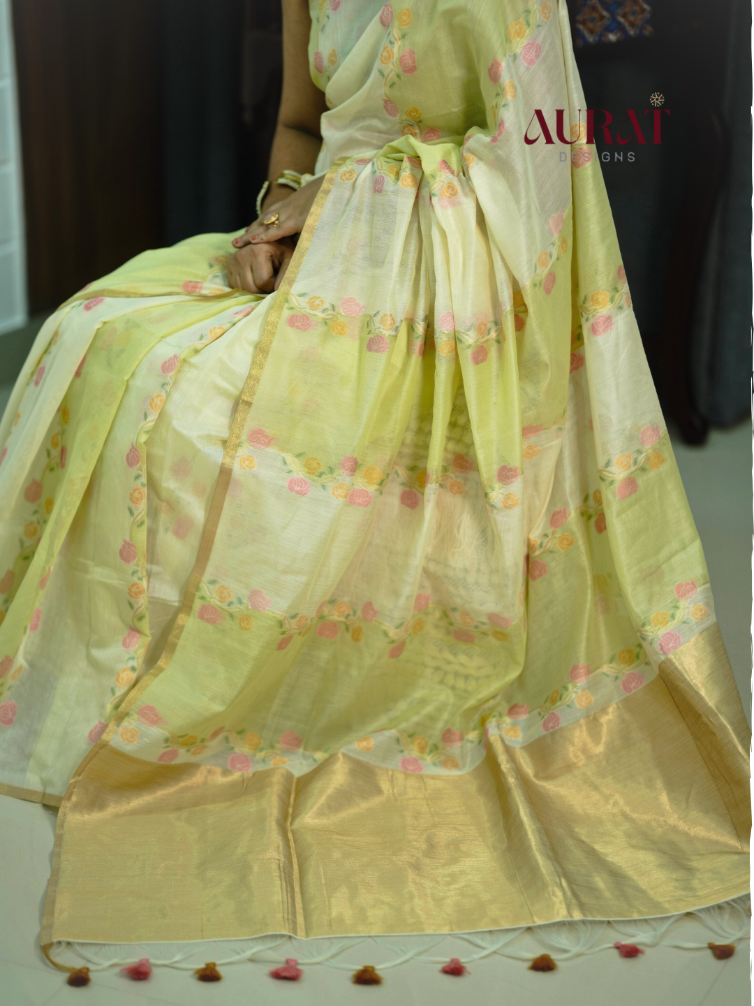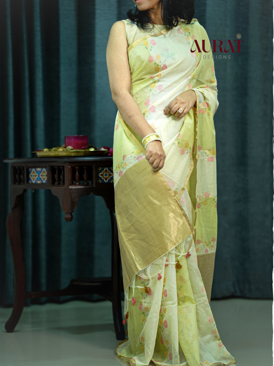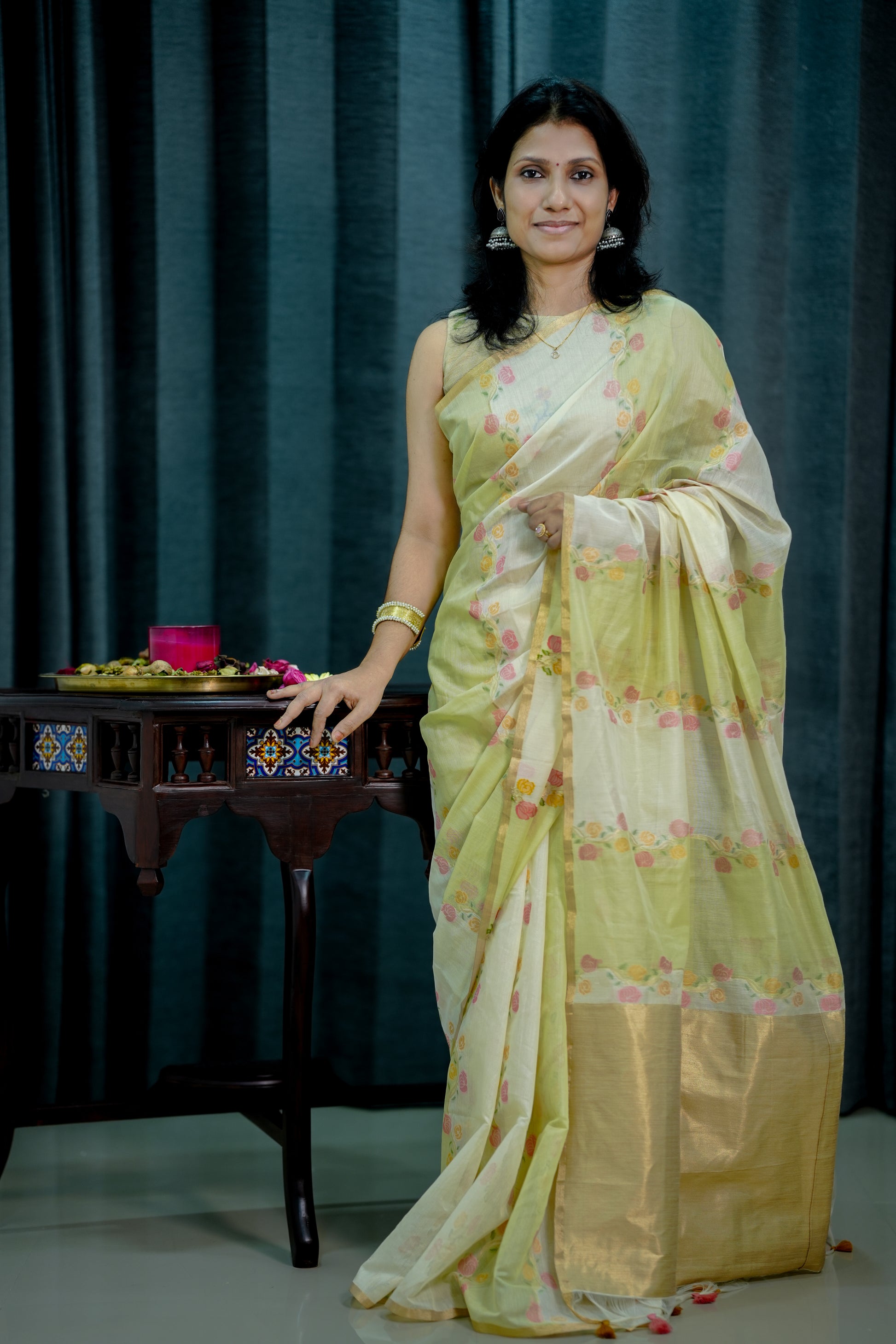 Saree work: Soft cotton silk saree off white and light green body with woven rose flowers