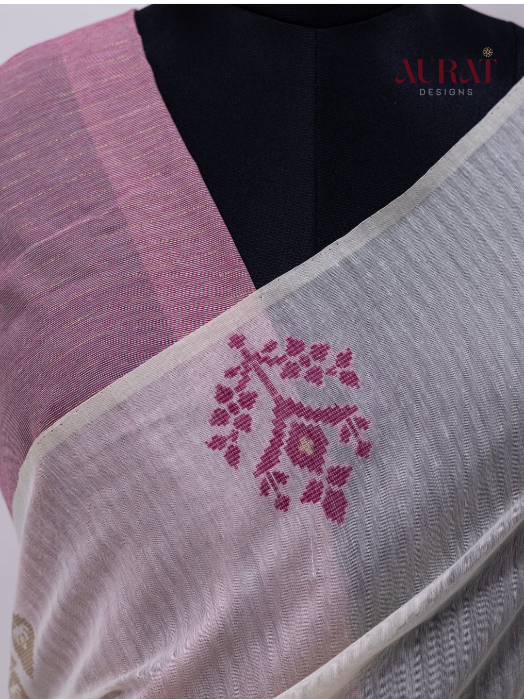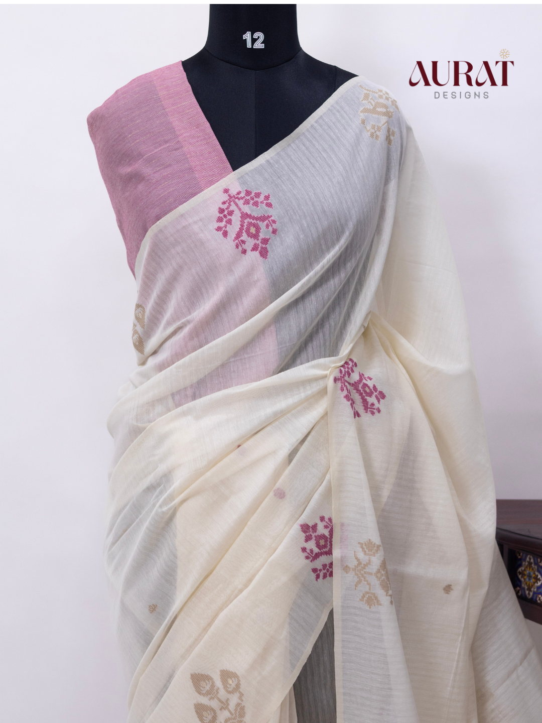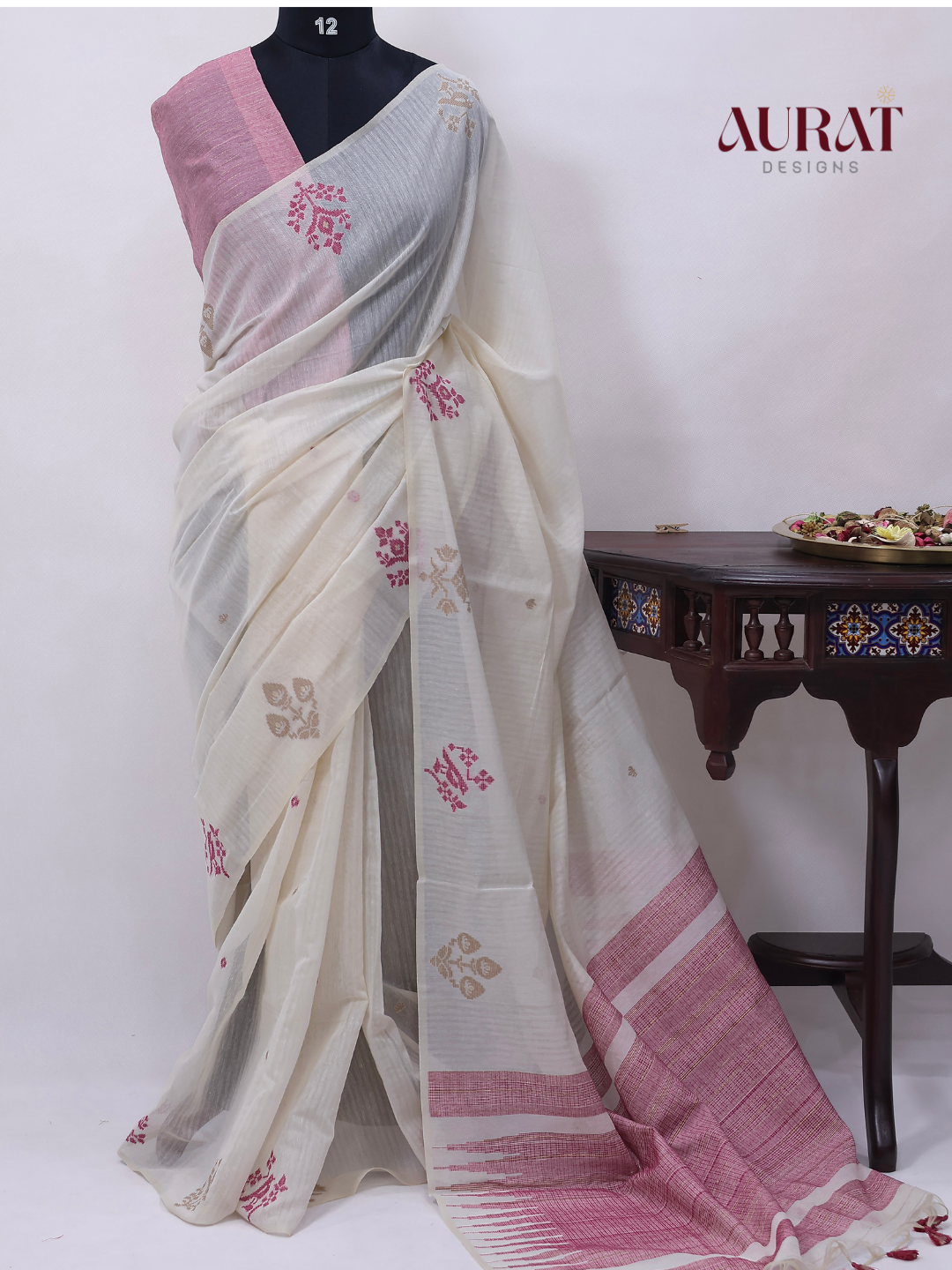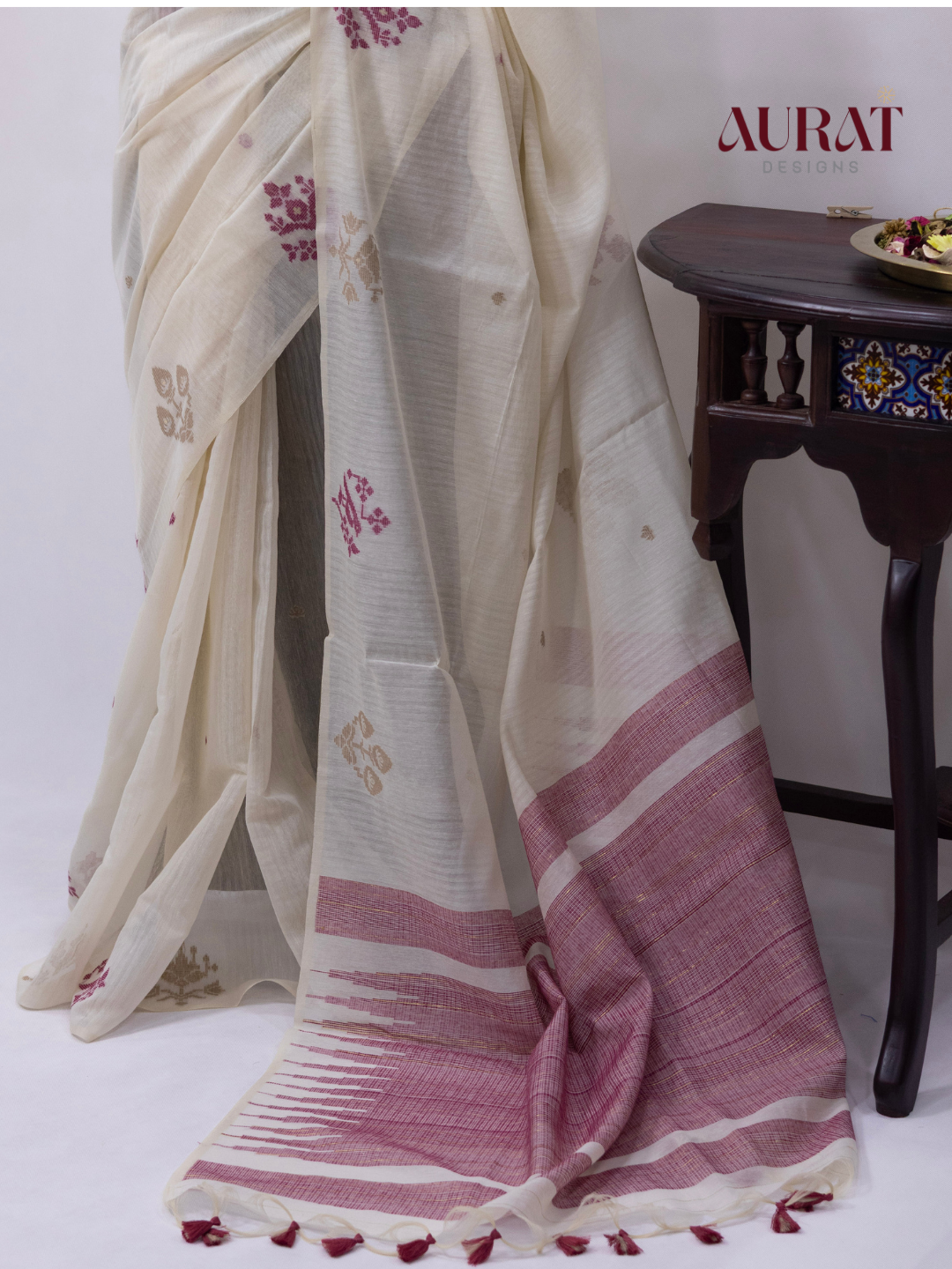 Saree work: Soft cotton silk saree off white with woven maroon jamdani patterns