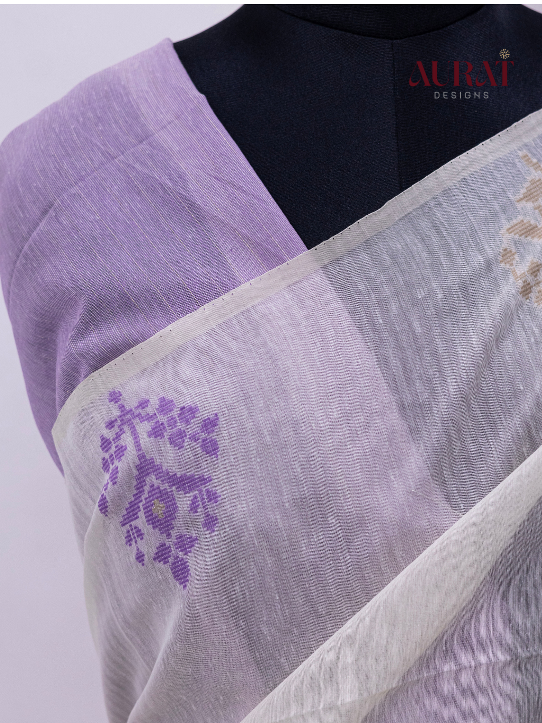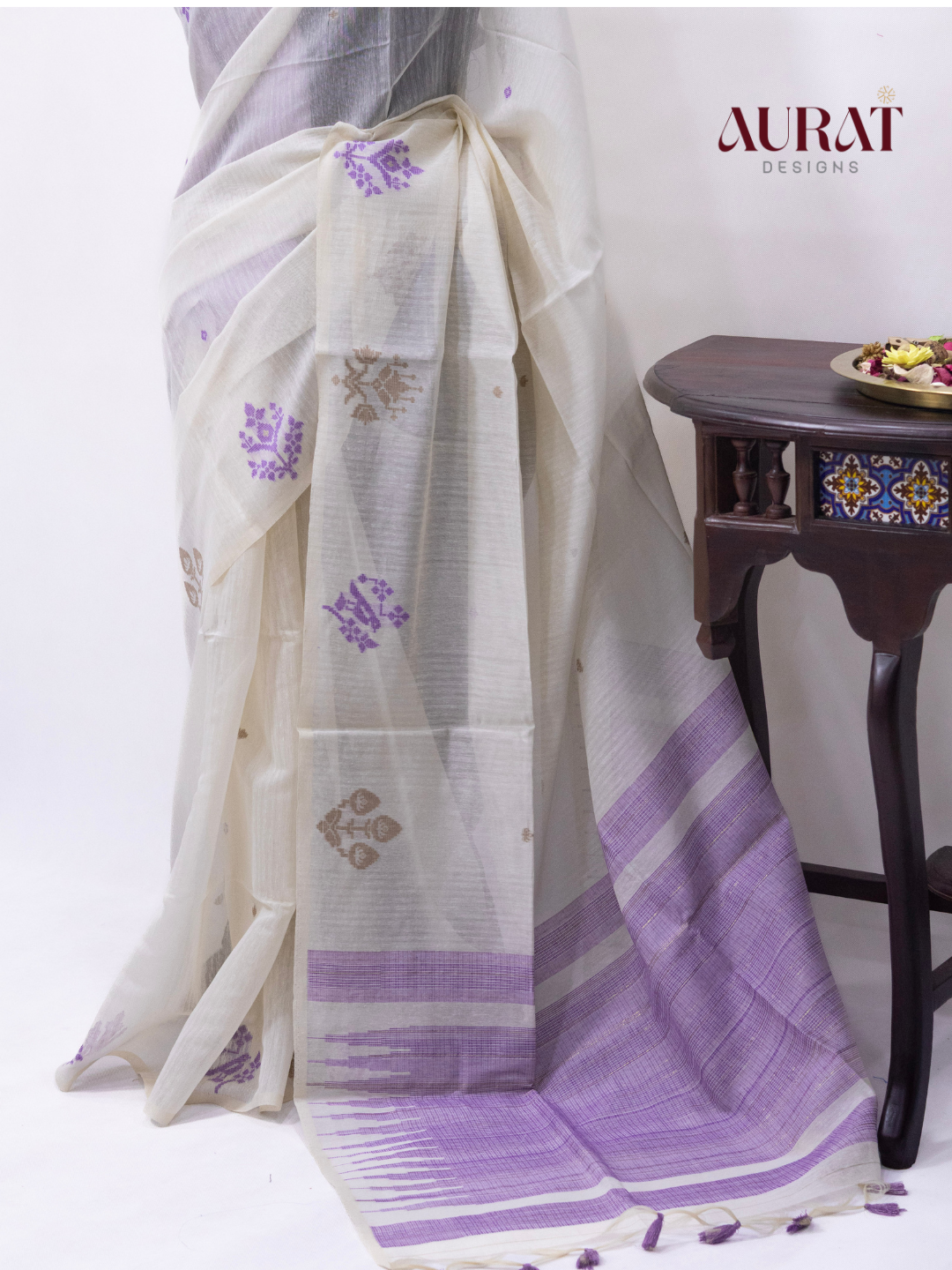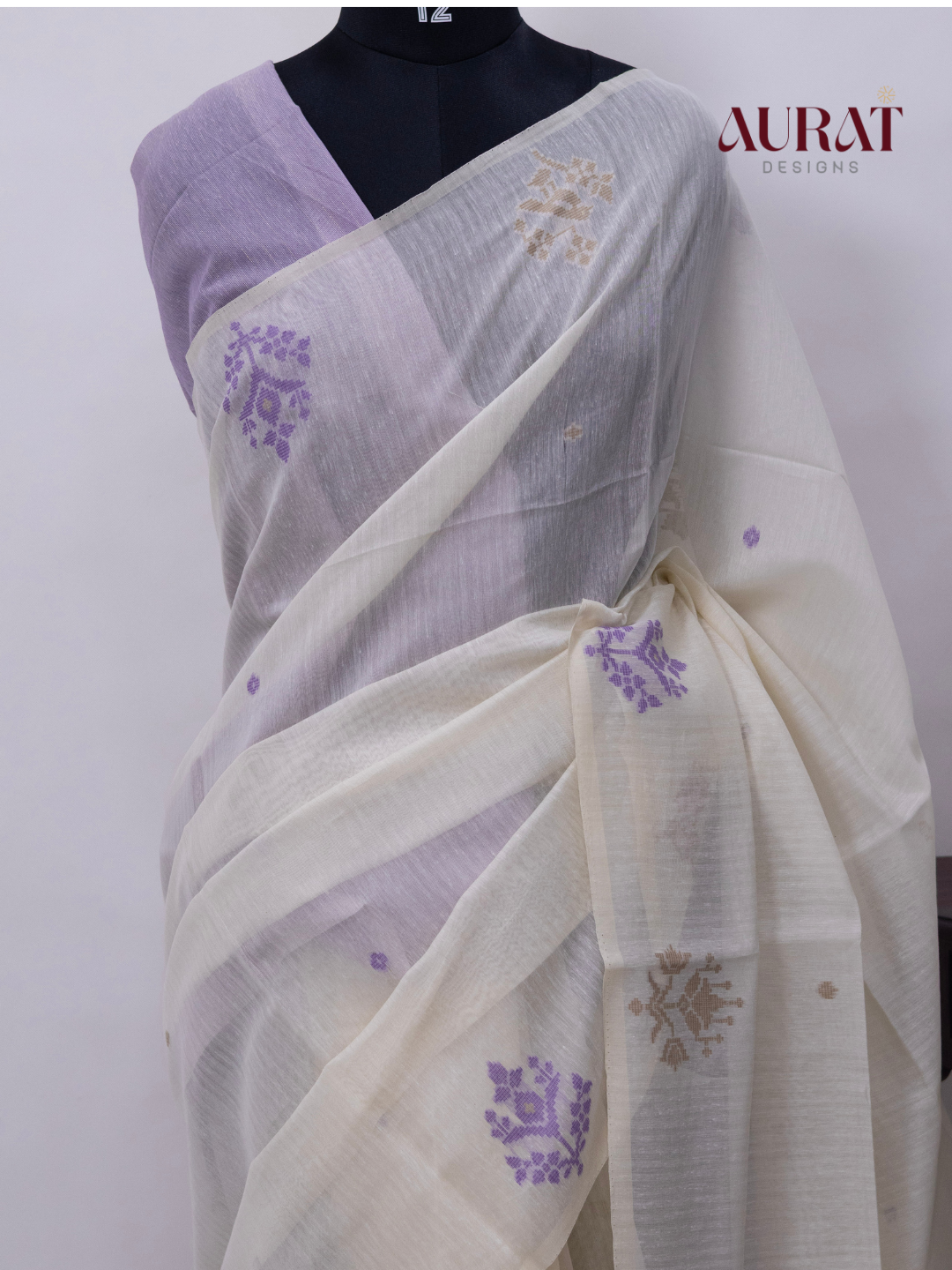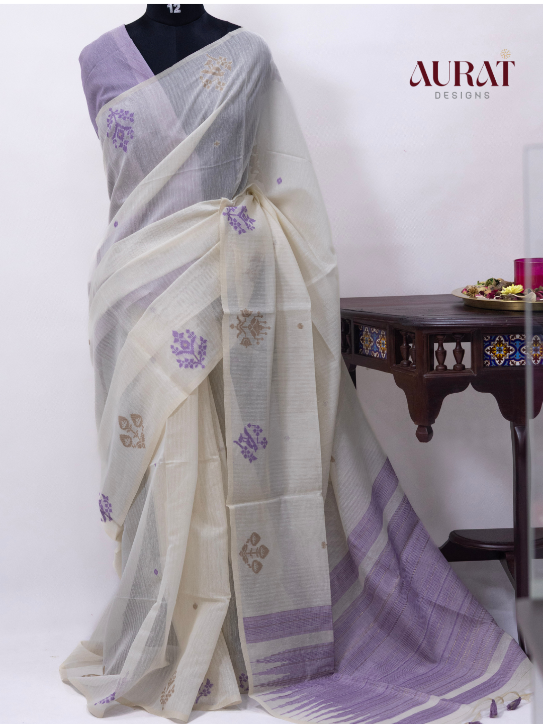 Saree work: Soft cotton silk saree off white with woven lavender jamdani patterns