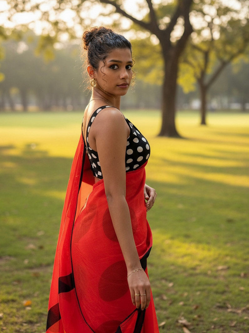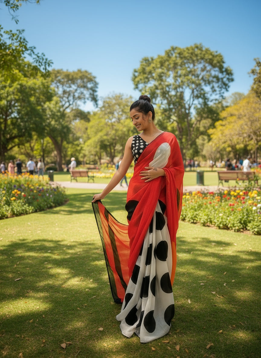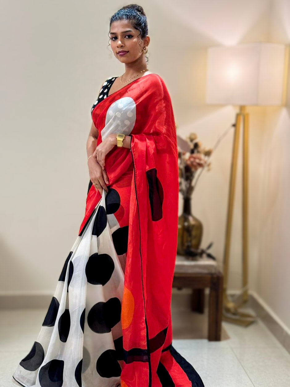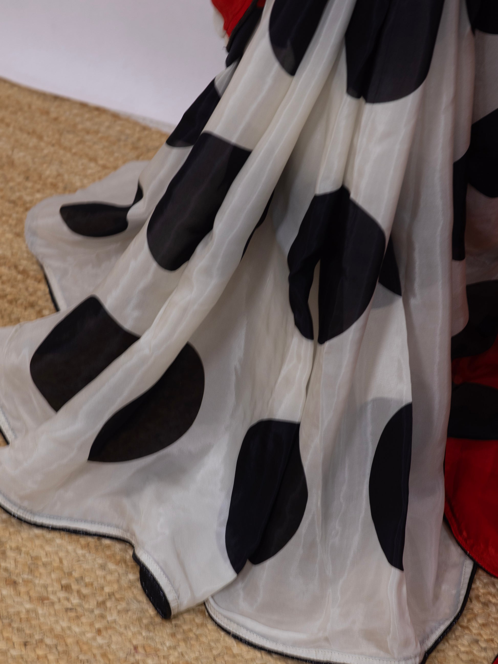 Blouse : YES, unstitched L=85cm and breadth=1.1m black and white polka dots