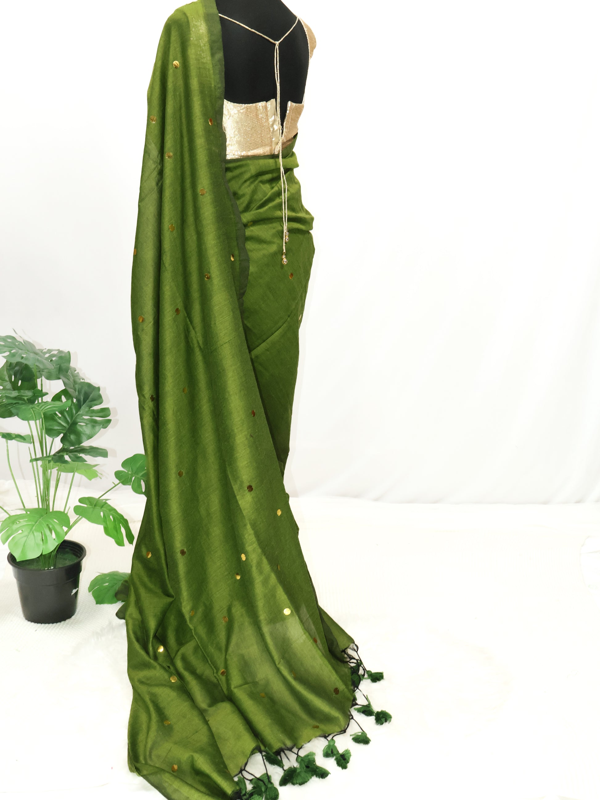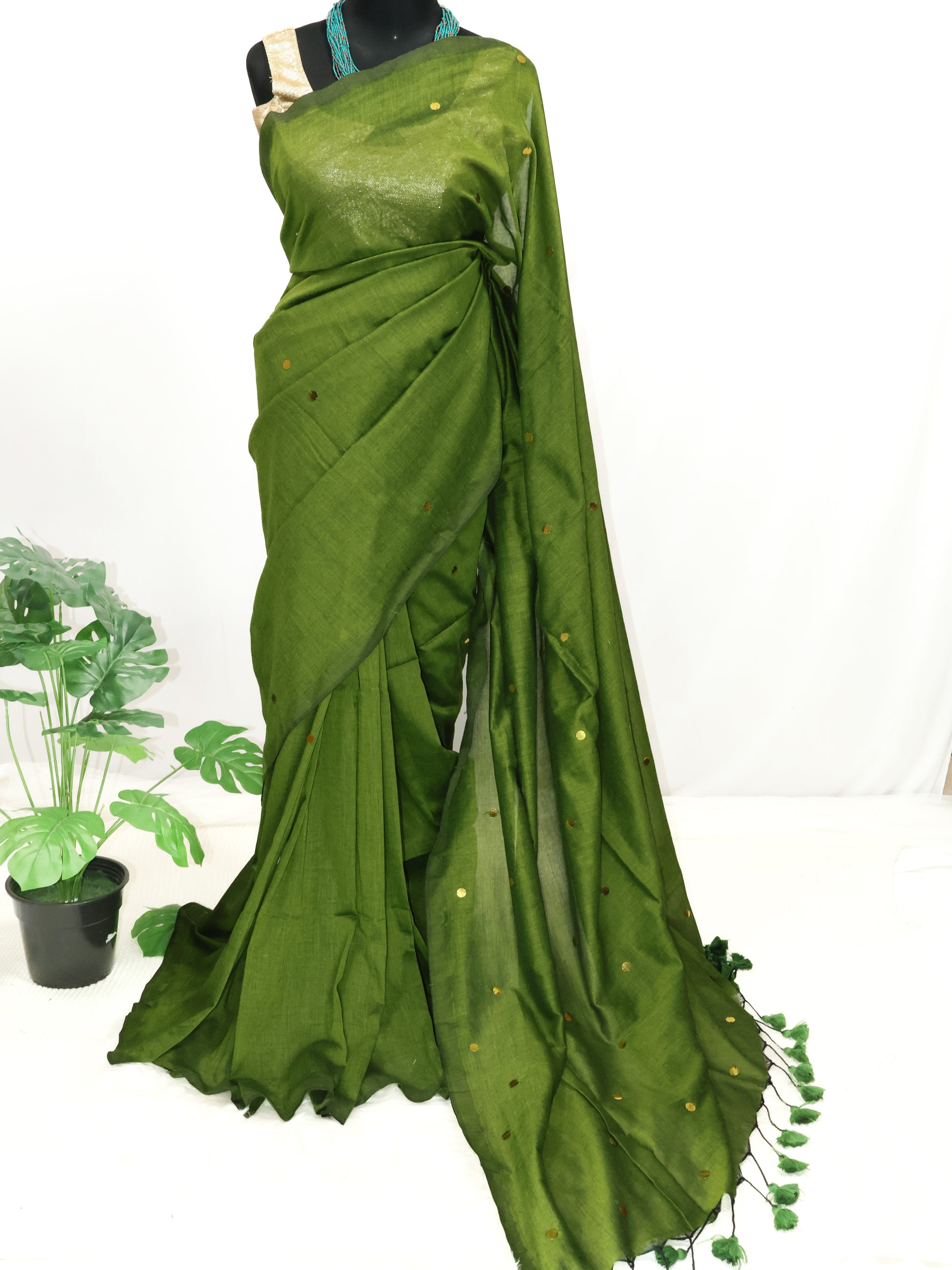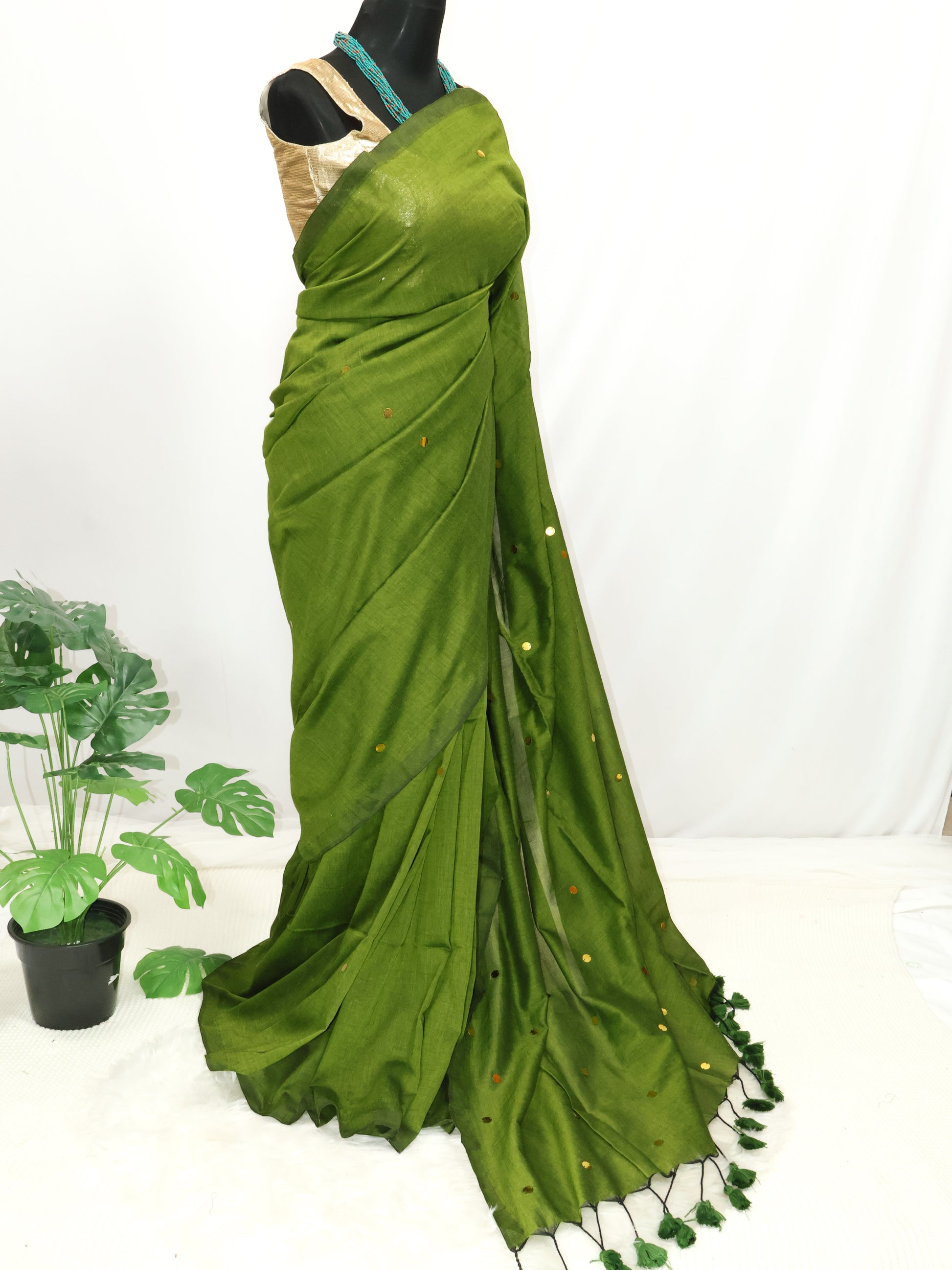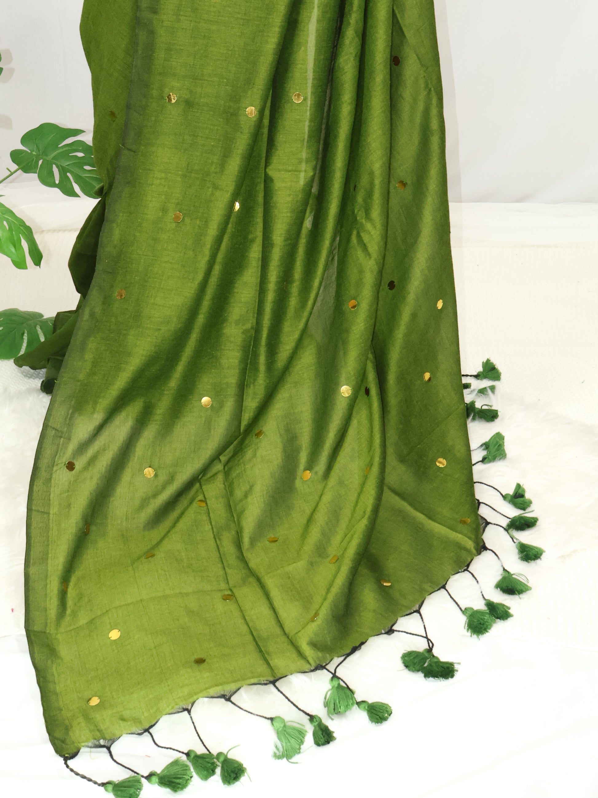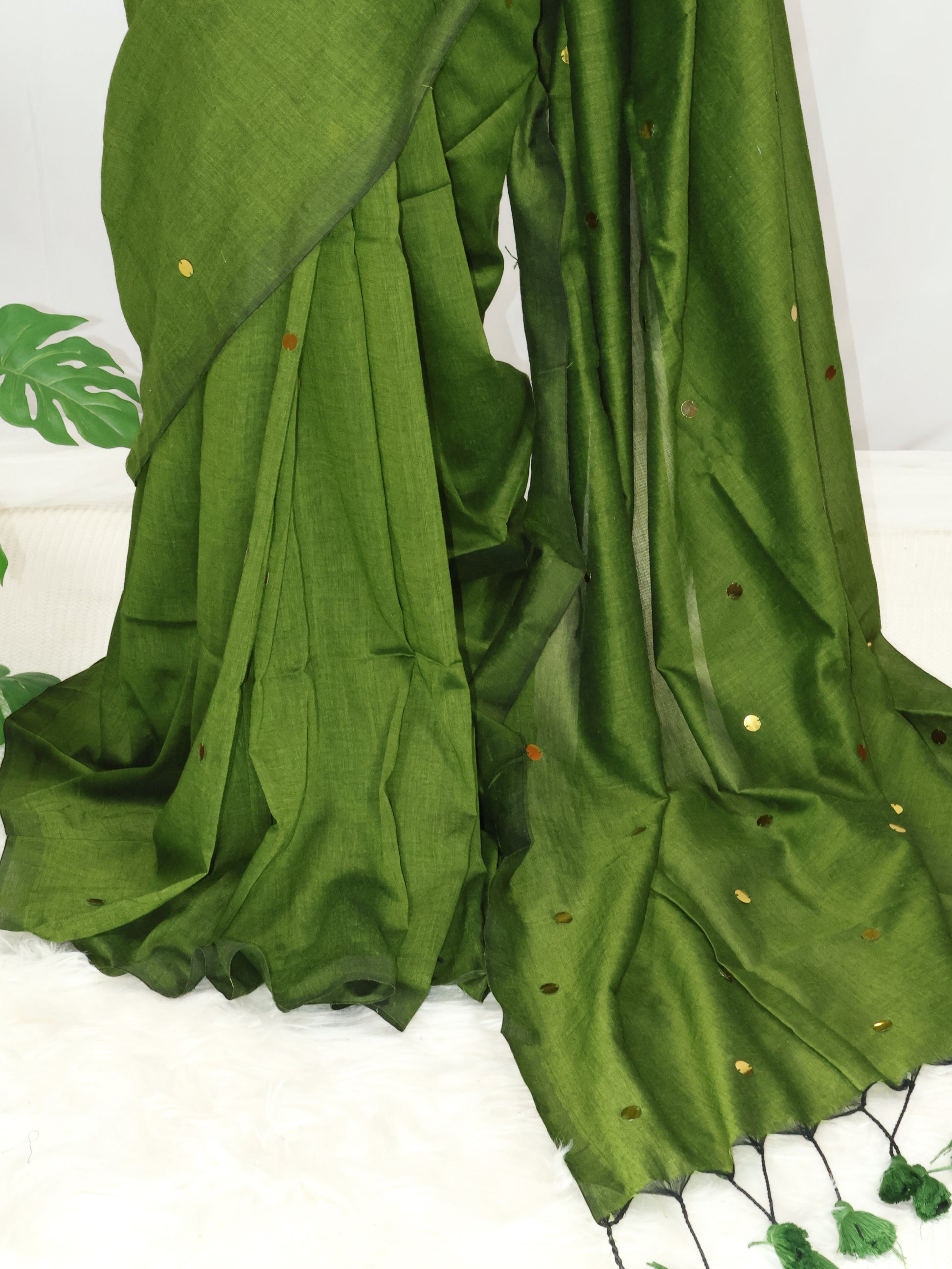 Green gini cotton saree with golden sequence and tassels.