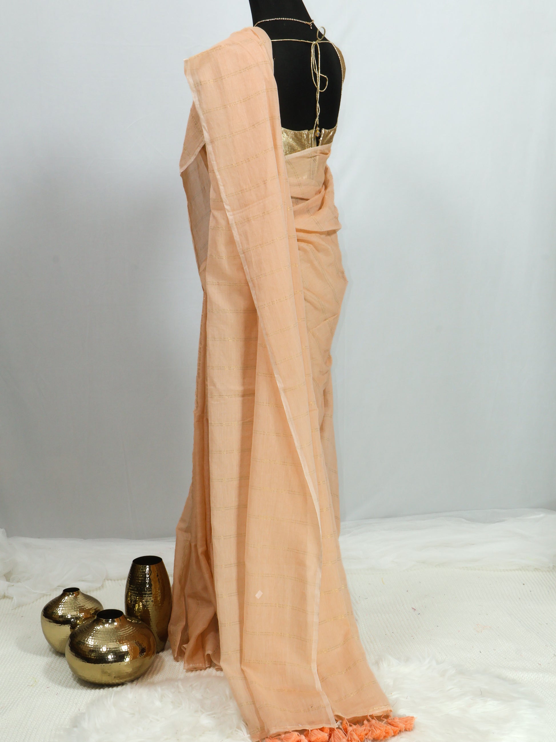Peach color golden body stripe mul cotton saree-S205