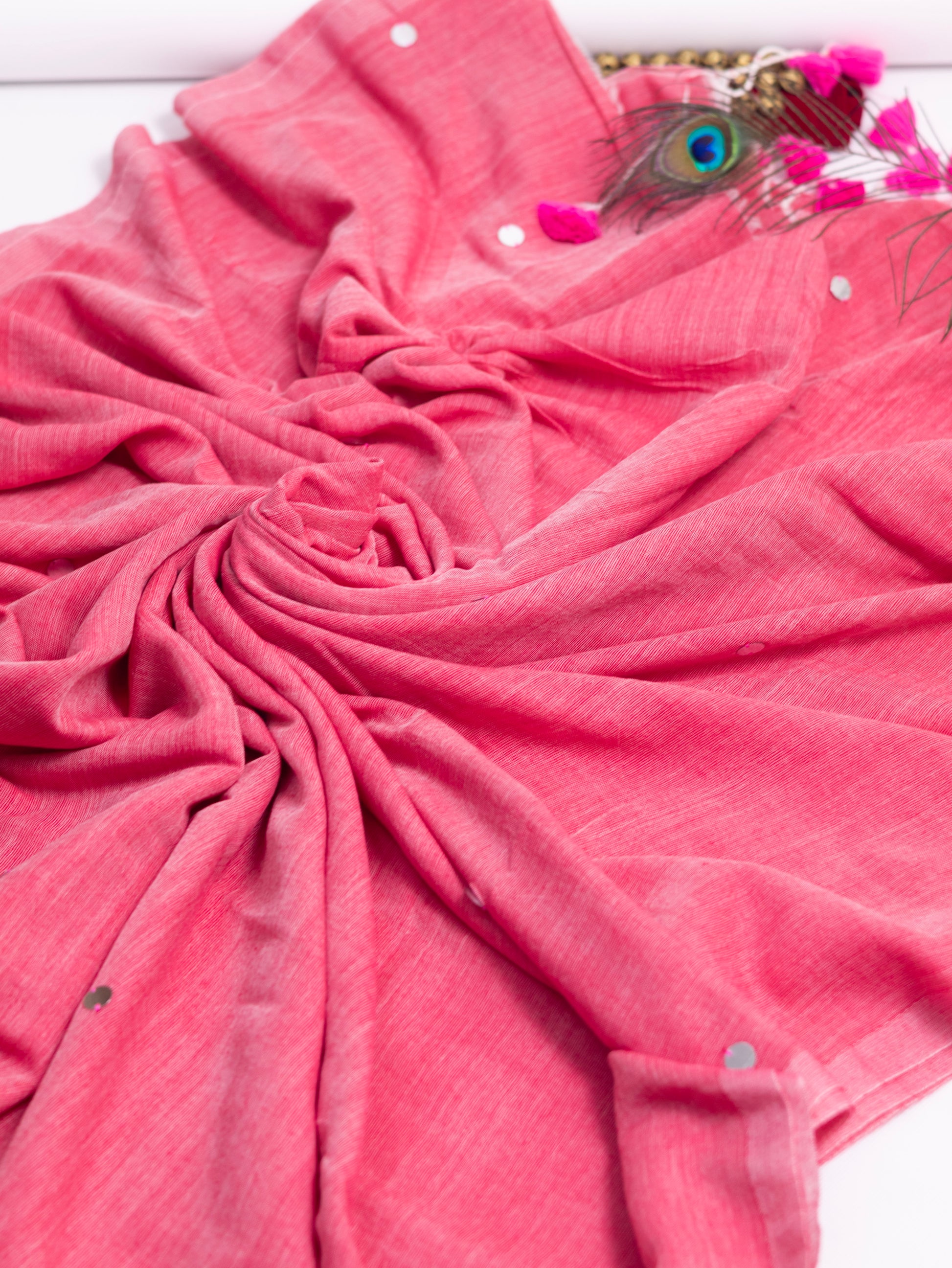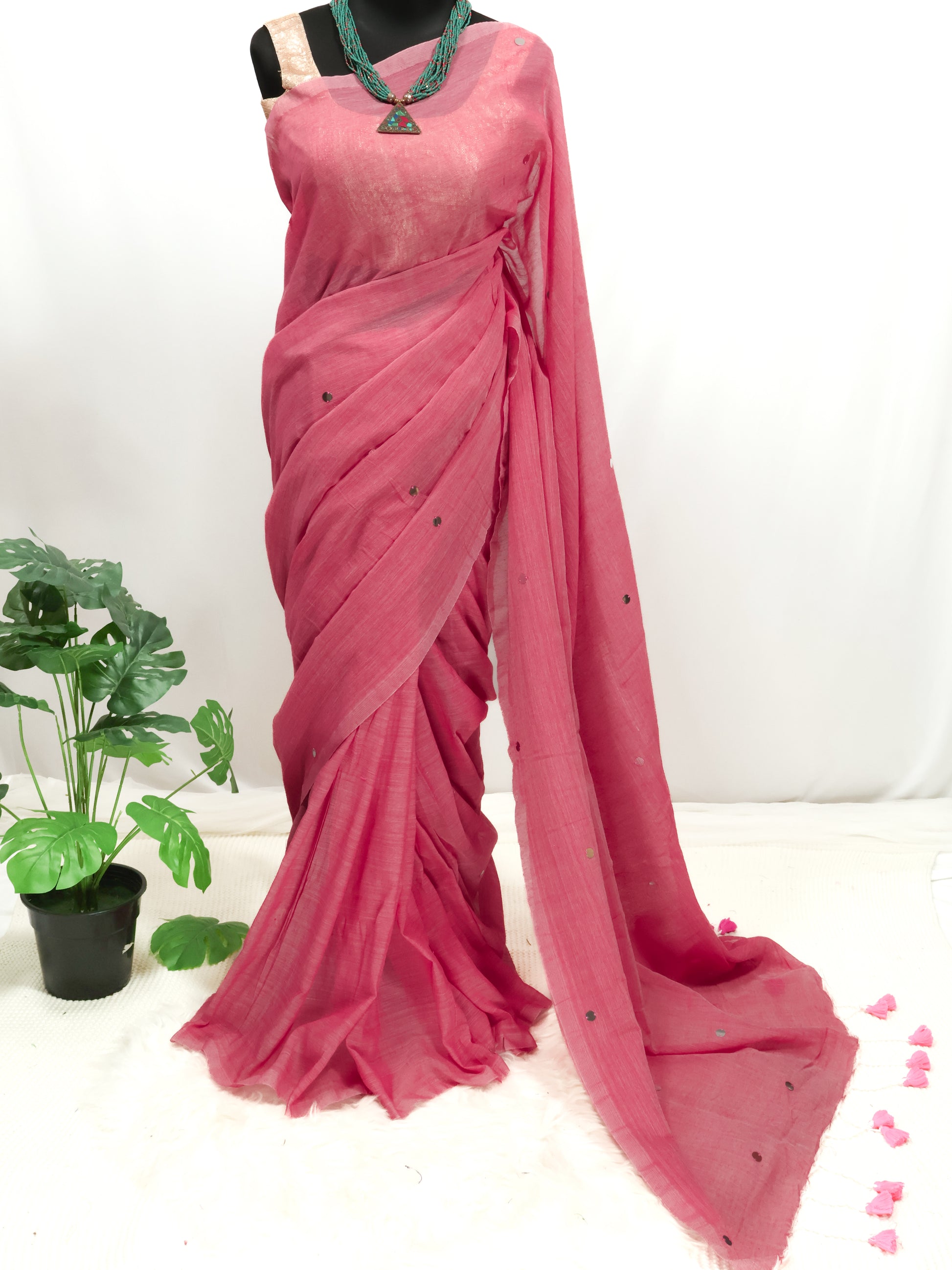 Pink khadi gini cotton saree with golden sequence and tassels.