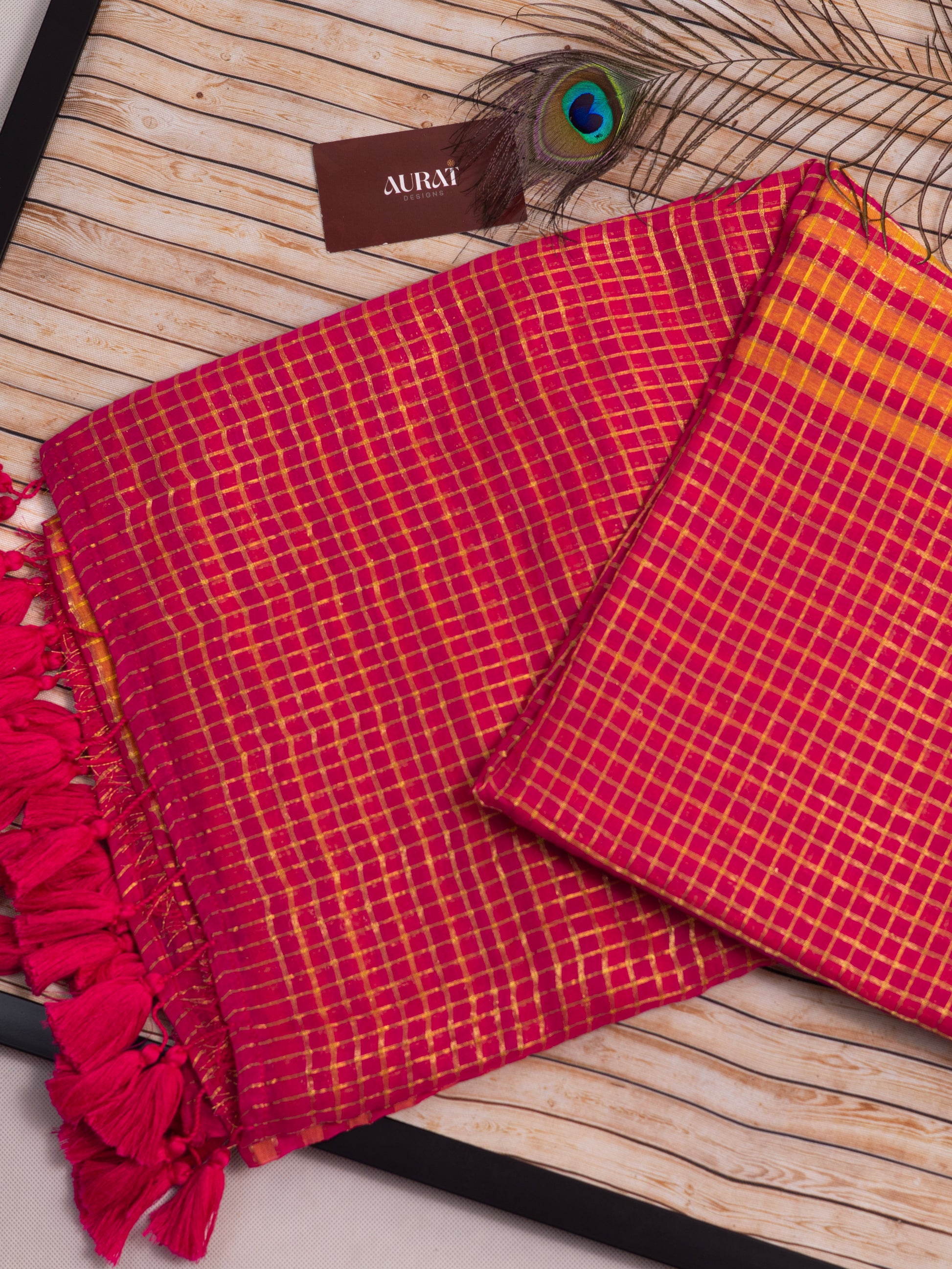 Rani pink-golden zari small box woven mul cotton saree-S201