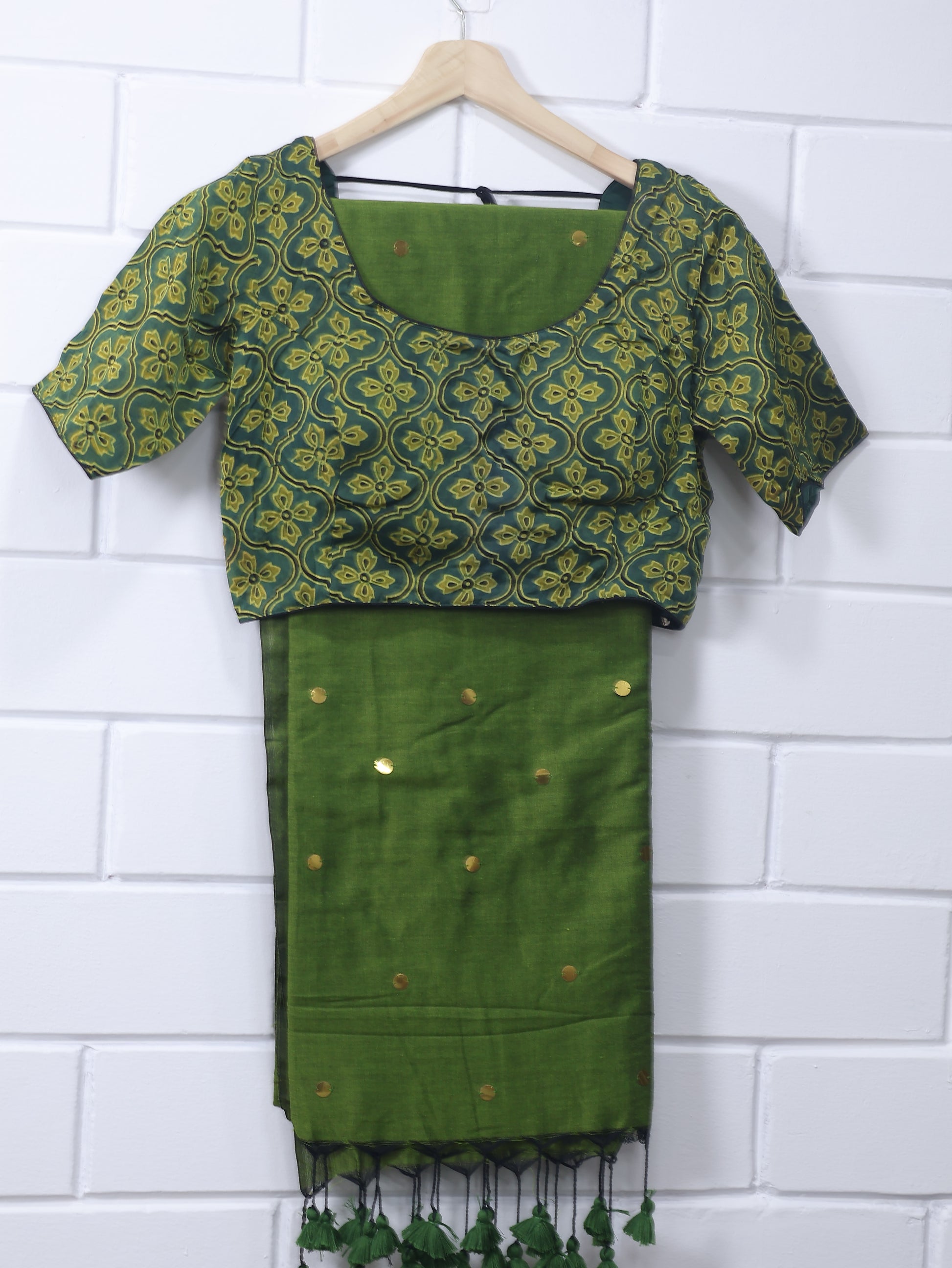Modal silk ajrakh ready made blouse and gini cotton silk saree combo