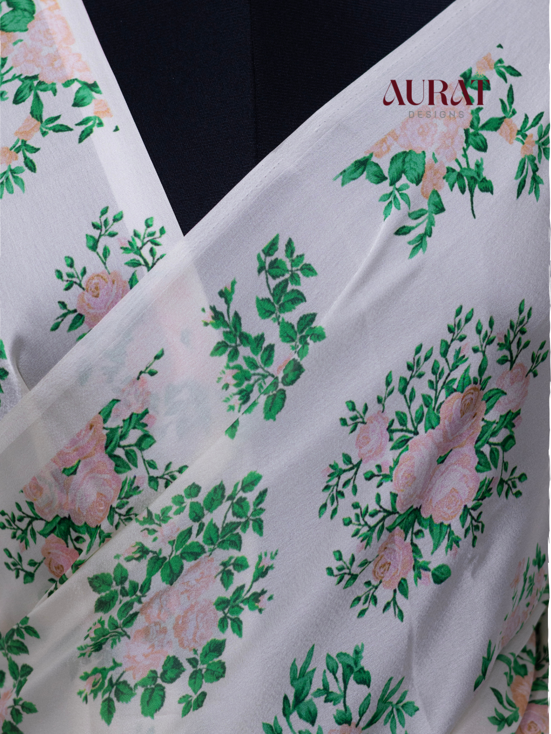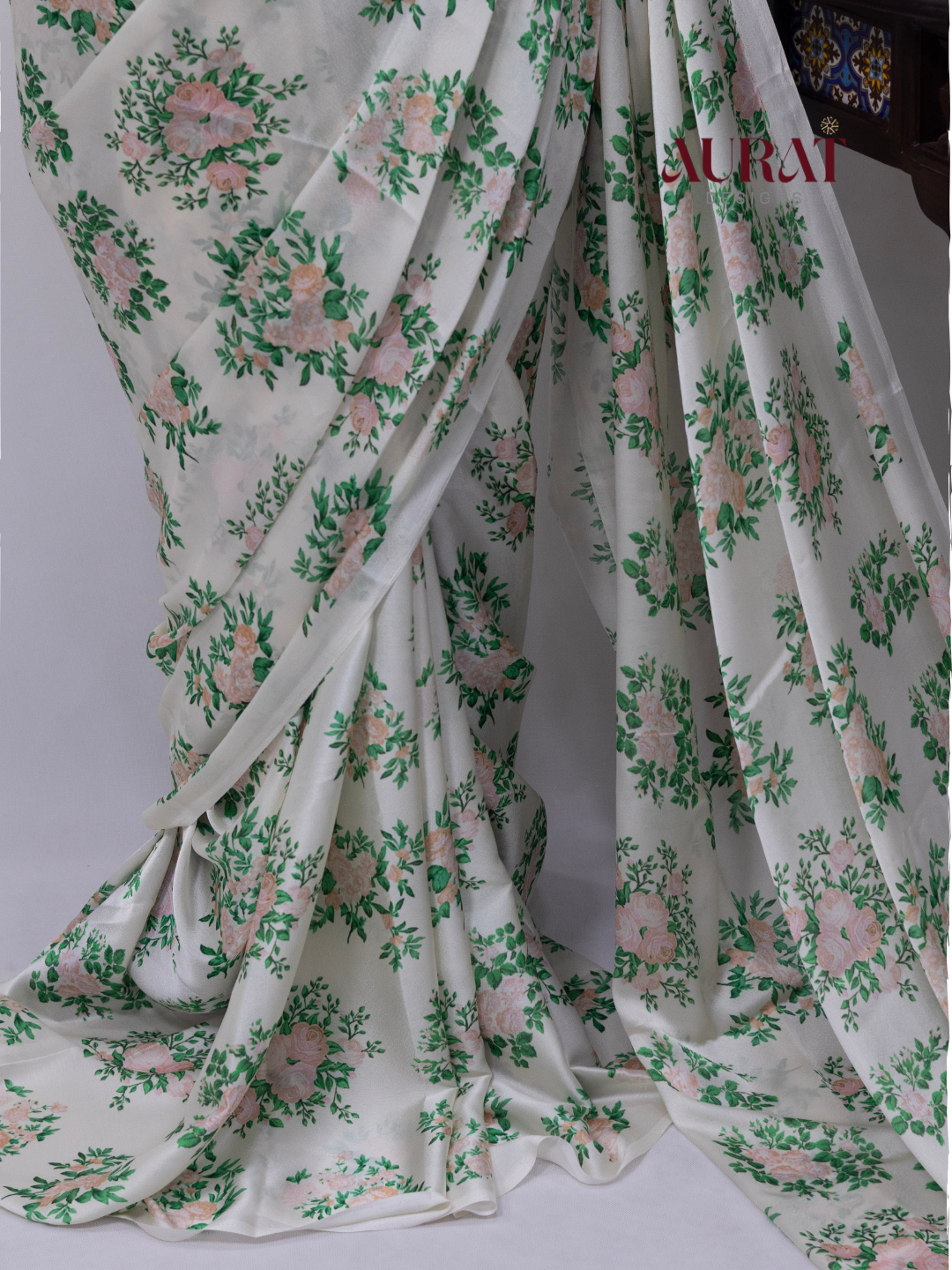Saree work: Soft satin silk saree off white with small pink and green floral prints