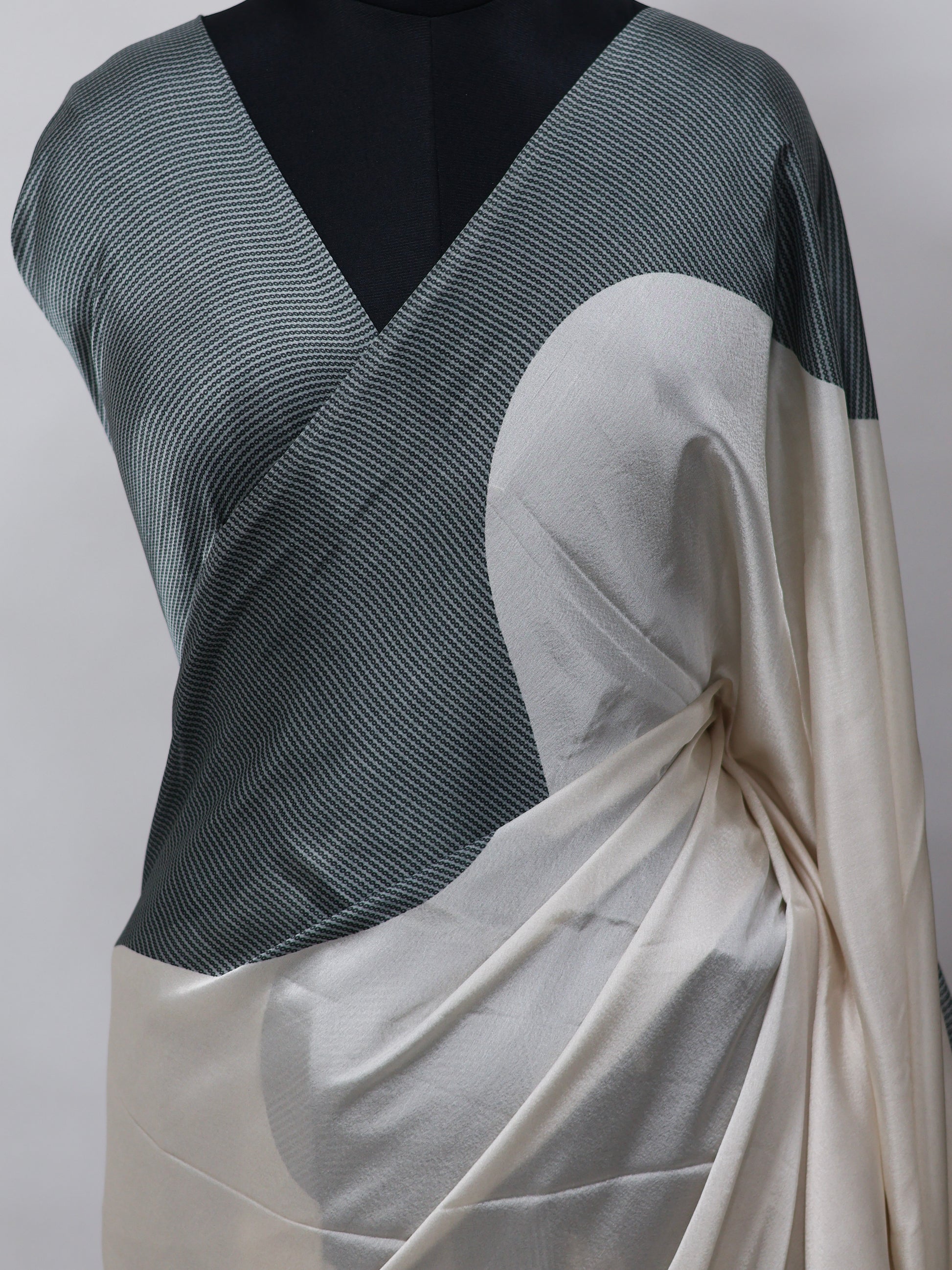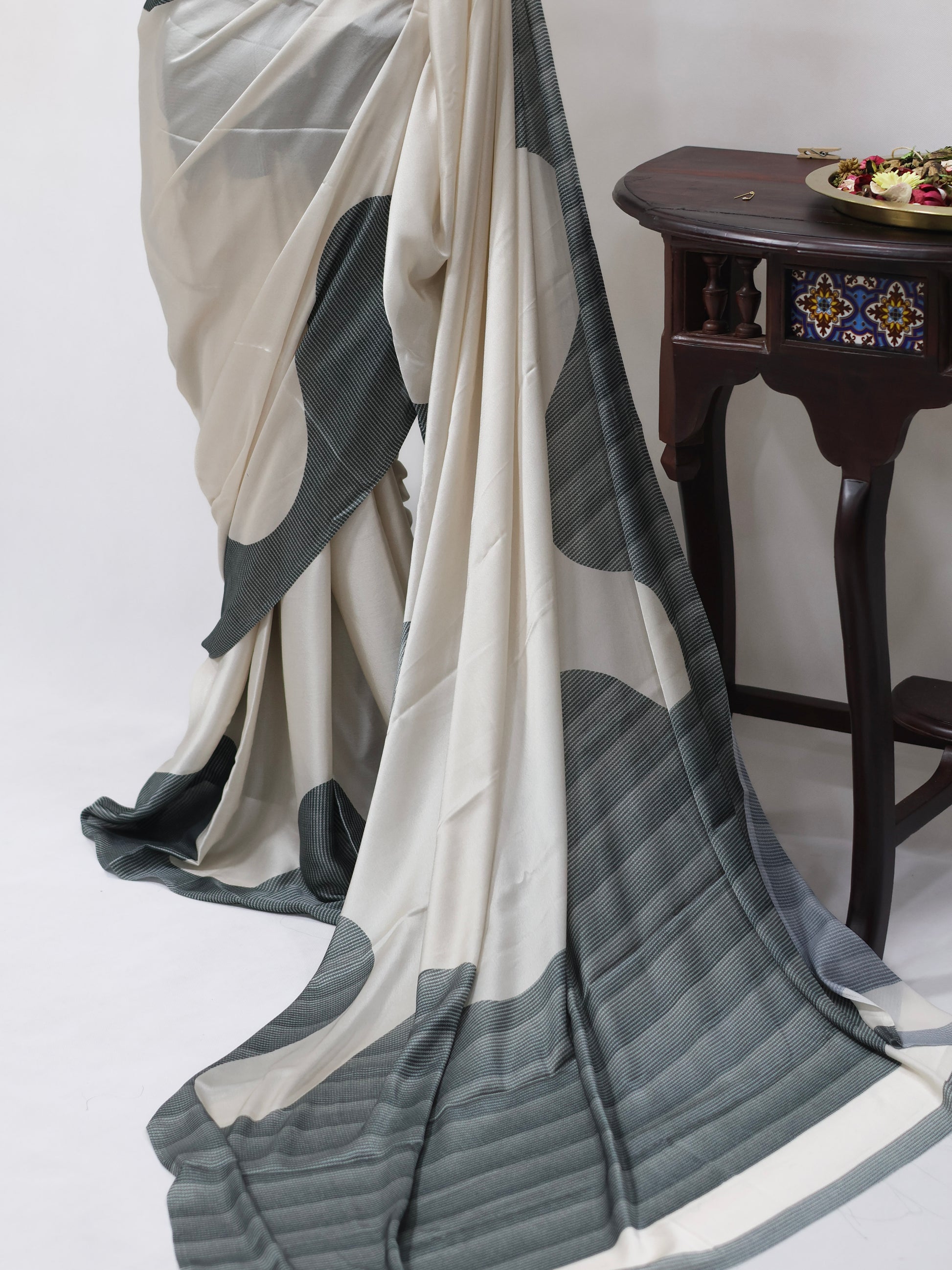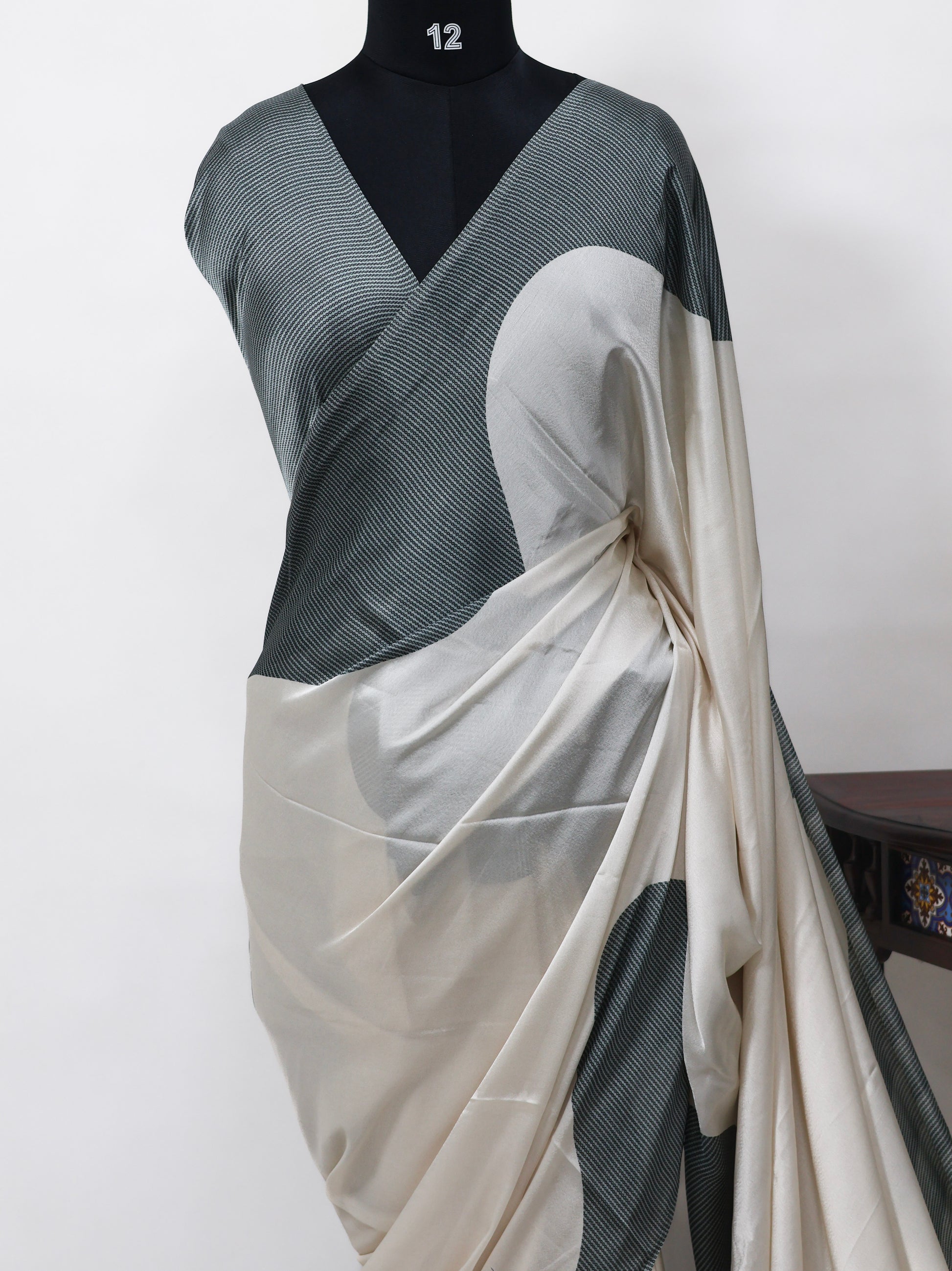 Saree work: Soft satin silk saree off white with wave like pattern prints