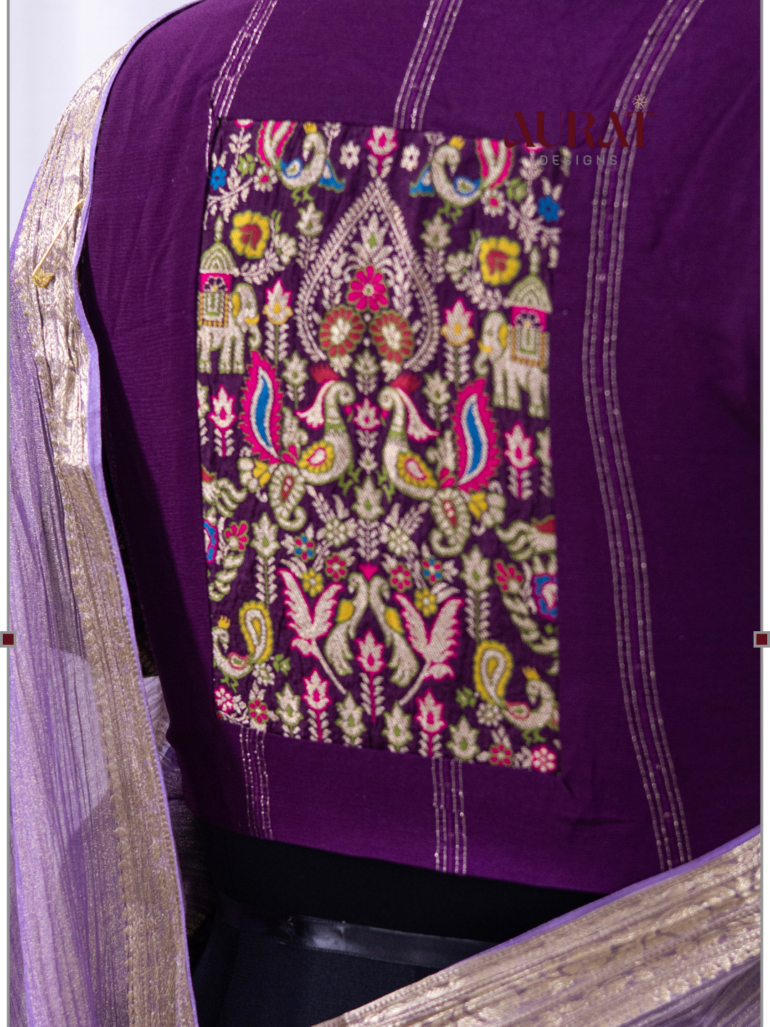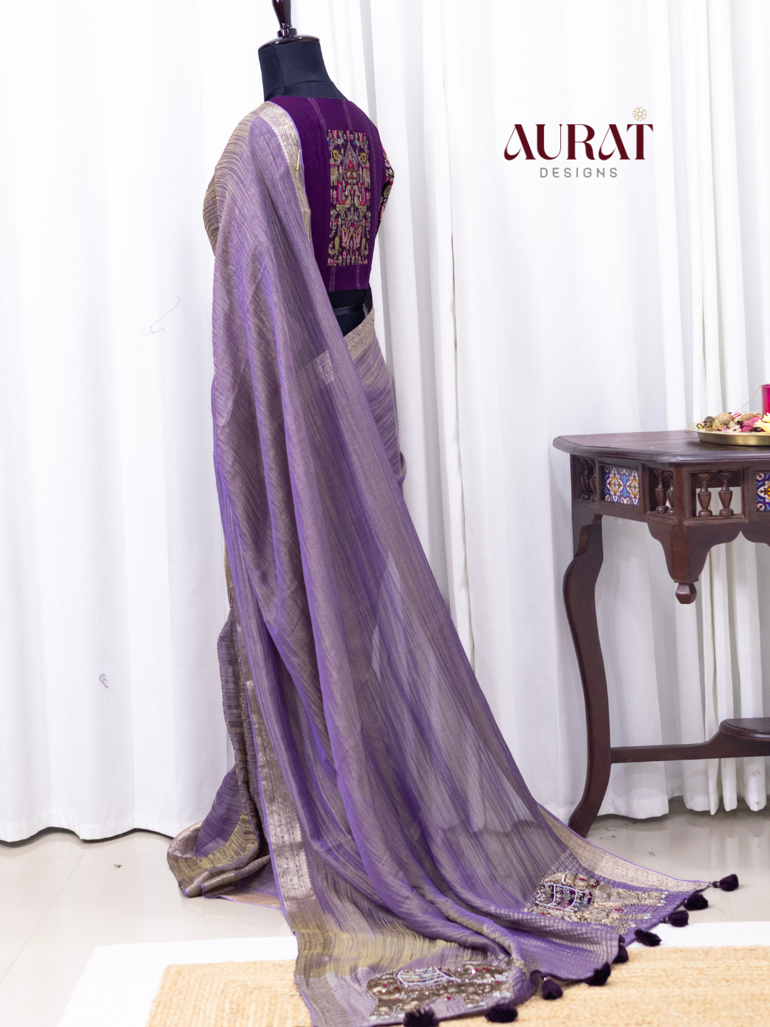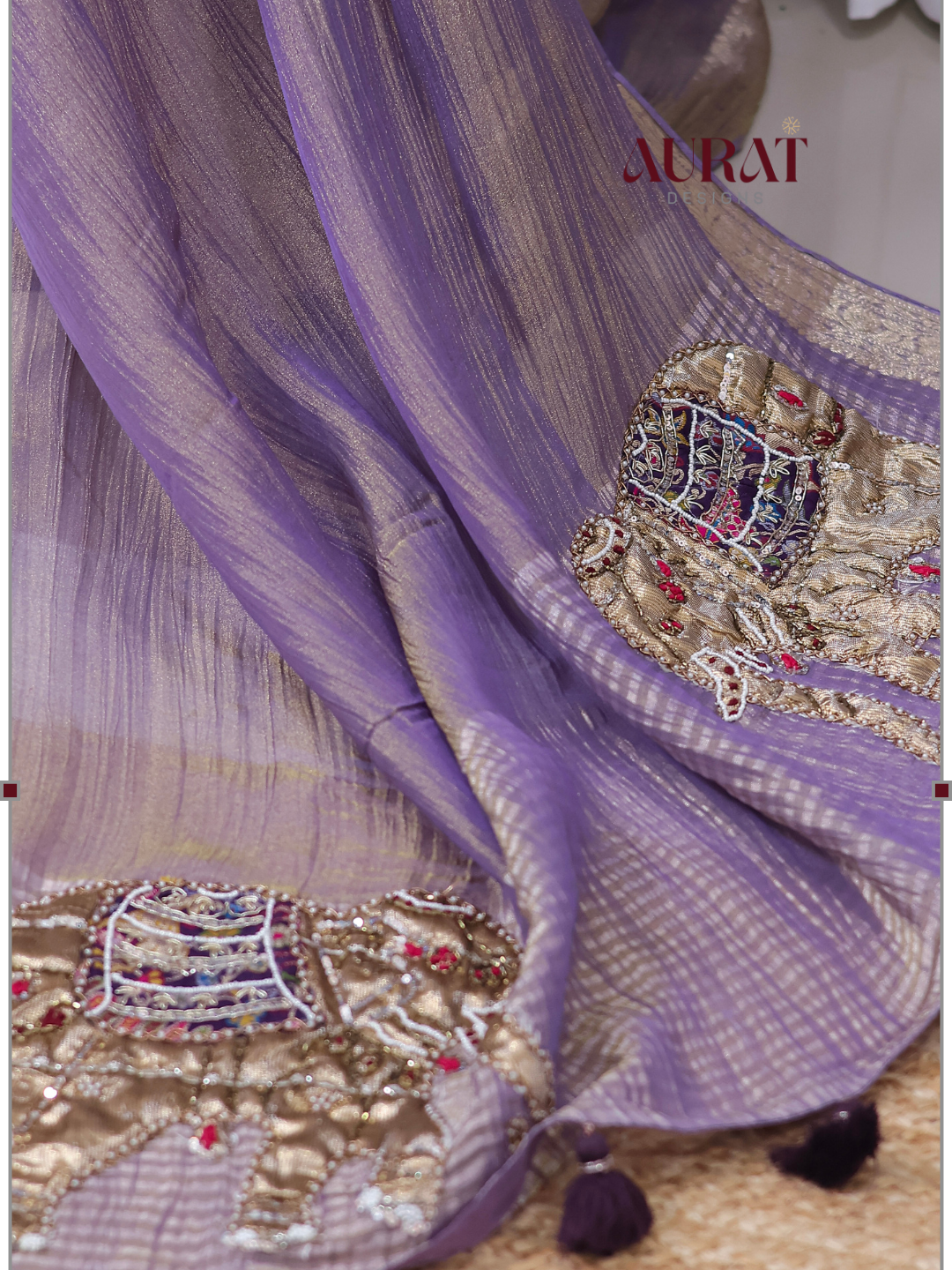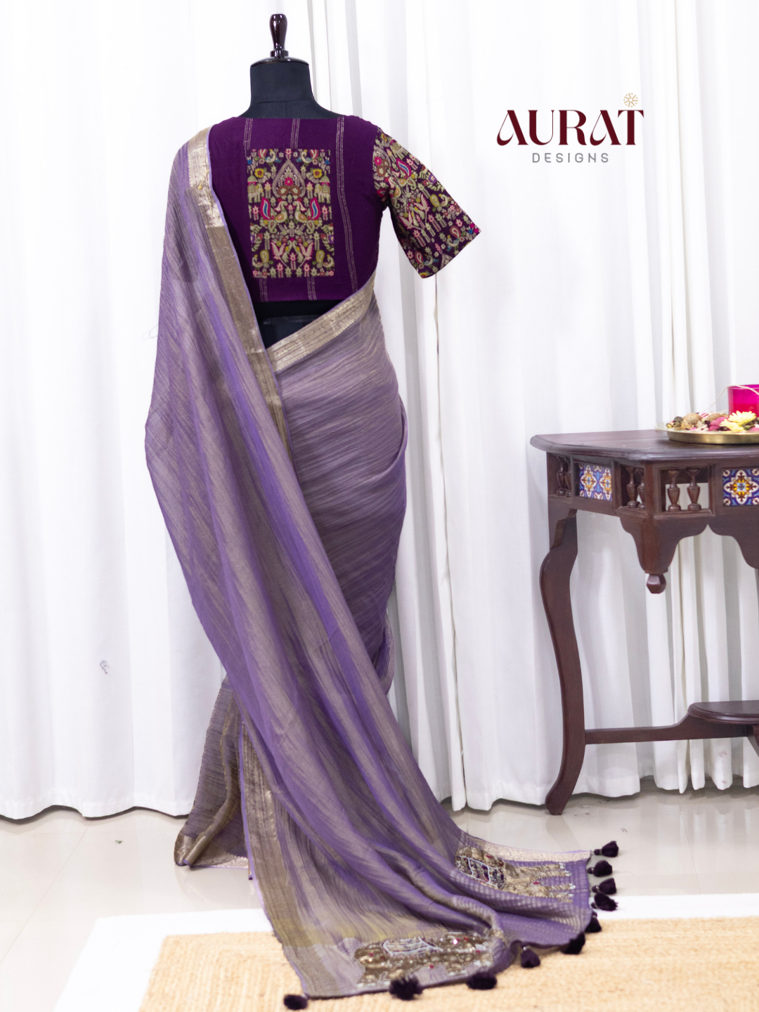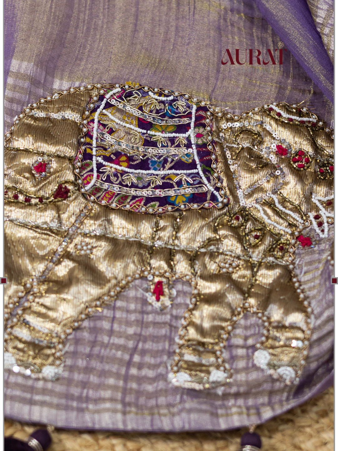 Crushed tissue silk saree with elephant patch work and stitched blouse