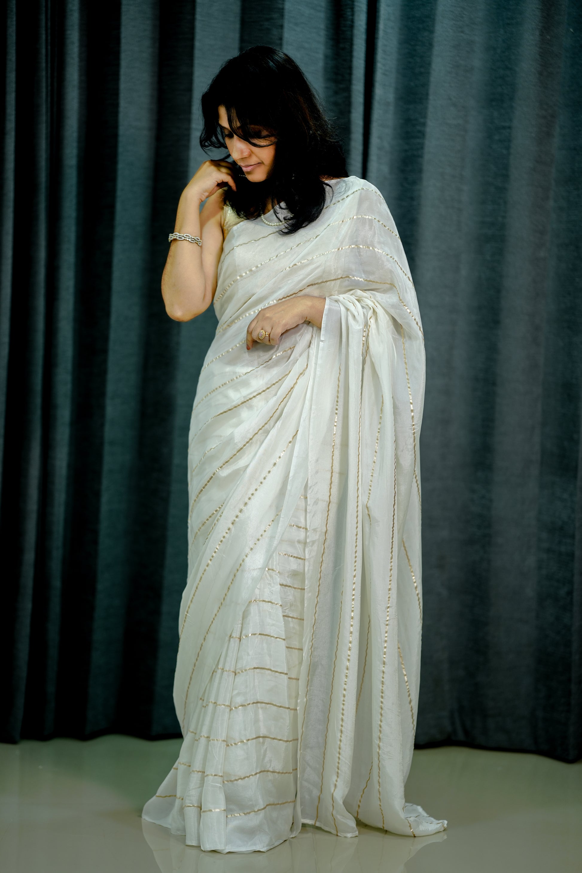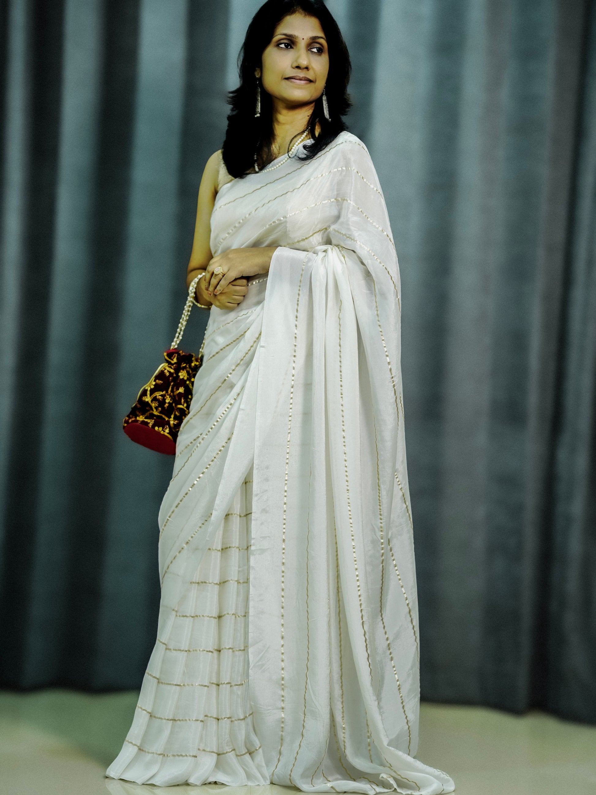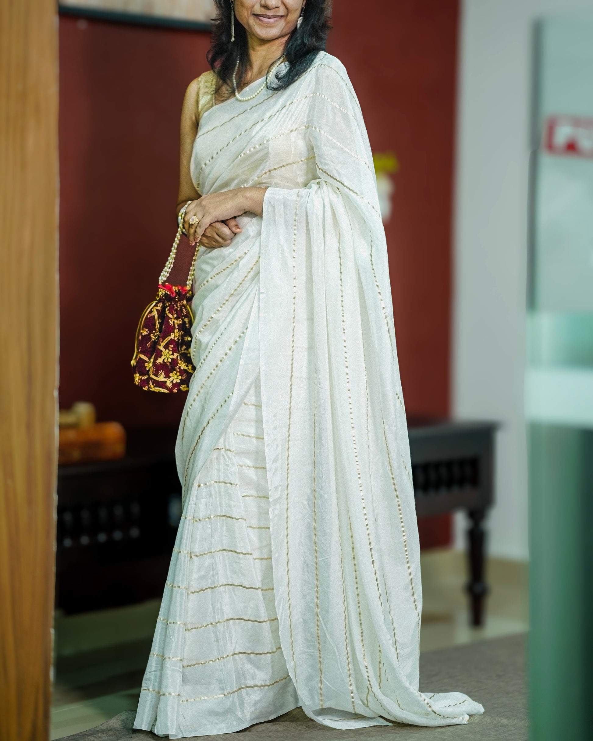 Saree work: Viscose organza silk saree with horizontal golden lines all over the body (dyeable)